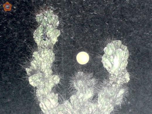 「掌」上月,真離奇! 仙人掌孤獨的站立,一輪明月卻高掛天空,伸出雙臂的仙人掌似有意擁抱月亮,無奈明月遠在天際,難「掌」握。