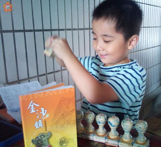 金沙鎮風獅爺護照近來廣受民眾歡迎,集章風潮也吹到幼生身上,金門家住劉澳的蔡昇峰,回金門放暑假,恰好搭上這波集章樂。不過,他不是忙著收集而是樂於幫遊客蓋章。他說,因為好好玩! 金沙鎮推出風獅爺護照,內容羅列金沙鎮四十五尊風獅爺,並有集戳章兌換紀念品活動,金沙鎮公所為管理方便以及導入人潮活動經濟,全鎮總共設有十二處蓋章處,多為鄉間店家,而民眾多半自己DIY,其中一處位於劉澳的集章處,幼生蔡昇峰化身小志工,熱心幫到訪民眾蓋章。 他將升讀幼大班,返金放暑假搭乘公車的體驗中,認識全島各聚落的村名,對於金沙鎮風獅爺護照中的聚落名字也能娓娓道來,觀察仔細入微,他說,樂於幫忙蓋章勝過收集,因為這是今夏有趣的體驗。