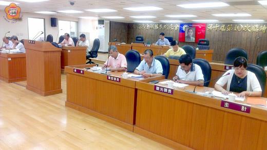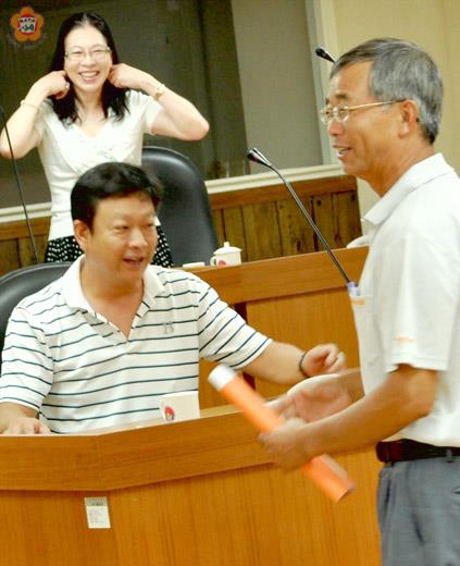 張建騰/圖文 燈,再不修理;人,就得修理! 在金湖鎮民代表會第十屆第十次臨時會的「臨時動議」中,鎮代李秀華(左後)質詢公所大樓地下的紅綠燈有問題-同一出入口,由外入內永遠綠燈,由內出外永遠紅燈。 承辦課行政課課長蔡福林解釋了一番之後,問答雙方似乎沒有交集;公所祕書蔡其朝(右)快刀斬亂麻,直接一句話:燈故障了,會後修理! 鎮代林長鴻(前左)表示,上次會期也就是這麼一說;若是燈再不修理怎麼辦;蔡其朝說:再不修理燈,那就修理人!