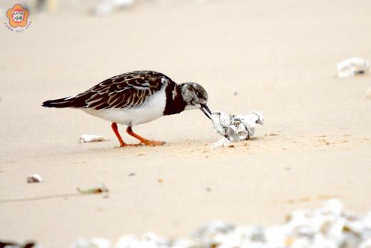 金門美味、翻石鷸最瞭解!立秋已過,金門最熱鬧的候鳥季又將到來,近日地區海濱已陸續出現許多鷸行鳥科鳥類,或過境金門繼續南飛、或停棲本島準備度冬,這些候鳥們都在金門豐富的潮間帶尋找食物充飢、補充體力,一隻翻石鷸昨日就在灘岸邊撿到一枚金門石蚵,準備以鳥喙啄開蚵殼,享用金門遠近馳名的美味石蚵。 這隻準備享用金門石蚵的翻石鷸是在昨天早晨於金門湖下海堤拍攝,翻石鷸在沙灘上撿拾到一枚被浪花拍打上岸的海蚵,隨即以鳥喙左右查看,準備打開殼蚵享用美味的鮮蚵,對美味食材的聰明選擇,認真採蚵的逗趣動作令人莞爾,可愛生動的表情動態使人發出會心一笑。更聯想到金門石蚵的美味不但讓人垂涎三尺、大動食指,就連鳥兒也難以抵抗金門石蚵的魅力,懂得選擇金門在地的天然食材,來一頓正港的金門石蚵大餐。 翻石鷸小檔案:(資料來源:台灣野鳥圖鑑) 科屬:行鳥形目、鷸科 英文名:Arenaria interpres 學名:Arenaria interpres 外型特徵與生活習性:身長約25公分。夏羽與冬羽不同,夏羽時頭部及胸部有黑白相間的花斑,對比明顯;冬羽時頭部、胸部及背部皆為灰褐色,僅肩部略帶紅褐色,頭胸的黑白花紋對比較不明顯。常於海灘、河口、岩礁海岸等地,單獨或成零散小群的活動,並以嘴喙翻開小石頭,啄食躲藏於其下的小動物,包括小蟹、節肢動物等覓食。