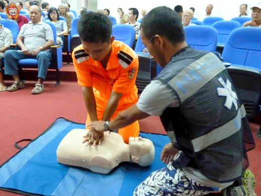 金門岸巡總隊為提升漁民及民眾初級救護技術與知識,接連在烈嶼、金湖、金城舉辦了三場CPR訓練活動。 根據行政院海岸巡防署中部地區巡防局金門岸巡總隊的說明,為提升漁民及民眾初級救護技術與知識,加強急救能力與專業知識,提升金門港區救護能量;金門岸巡總隊與金門縣衛生局、金湖消防分隊、金城消防分隊、烈嶼消防分隊分別於烈嶼鄉、金湖鎮及金城鎮地區舉辦三場港區心肺復甦術(CPR)訓練活動,並藉此發揮海巡「為民服務」精神。 三場訓練活動中,金湖場是於八月六日在新湖漁港漁會大樓二樓舉辦,共有五十六人參加;金城場是於八月八日在金水里里民活動中心舉辦,縣議員許華玉也全程參與。 課程內容包含急救標準流程、患者身體評估以及學員實際操作演練等,並於課後發放合格證明貼紙。 根據金門岸巡總隊的說明,漁民及民眾掌握了心肺復甦術的操作知識,於出海作業或居家遇有緊急狀況時就可立即派上用場,搶救寶貴的生命。