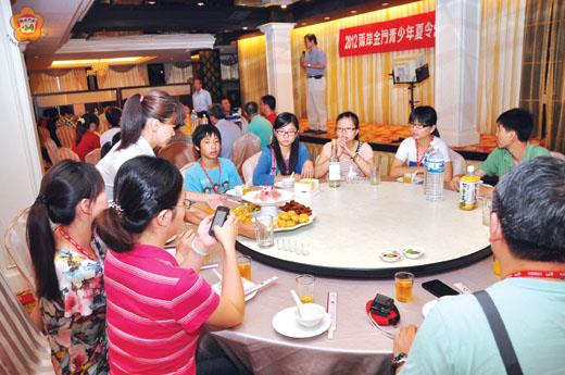 歡迎回金門吃家鄉菜!兩岸金門青少年暑期夏令營昨正式登場,縣府晚間席設葡京餐廳宴請學員們,縣府主任秘書盧志輝坐鎮主持,為兩岸三地返鄉學員們接風,盧志輝並以僑領楊忠禮為例,鼓勵學子們多瞭解金門飲食文化,嚐嚐父母口中念念不忘的家鄉菜! 這項宴席活動是在昨天晚間六時整於葡京餐廳舉行,與會人員除了七十餘名自廈門、台灣等地抵金的學員外,縣府主任秘書盧志輝、教育局長李再杭、社會局長方天吉等也出席與會,歡迎學員返金探訪故鄉。 宴席過程中,主任秘書盧志輝致詞時表示,金門的飲食文化及菜餚特色獨樹一格,甚至連馬來西亞僑領楊忠禮都念念不忘,日前還特別派員抵金學習烹飪技巧及食材運用,他鼓勵學員們在宴席過程中不妨多瞭解菜色蘊藏的文化意涵,認識道地口味的家鄉菜。 而餐廳業者在上菜過程中也特地安排了「宴菜」、「烘肉」等本地菜色,讓學員嚐試純正的金門料理,而教育局人員也特別介紹了本地「雞頭魚尾」的習俗,向學員們解說各項菜色的傳說典故,許多學員聽及本地菜餚的故事是大感驚奇,還不時拍照留念以為見證,在餐宴中享受了一趟集合了飲食、文化、歷史等意涵的美味家鄉晚餐。
