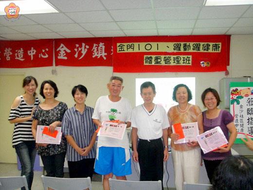 「金門101,躍動躍健康」,金沙鎮社區營造中心第二年開辦體重管理班,六月四日起開跑,三十六人報名,二十六人堅持到底,兩個月時間共減重五十九點六公斤。金沙衛生所主任黃煥星表示,健康是一輩子的事,勉勵瘦身有成的學員持之以恆,持續為自己的健康加分。 金沙鎮社區營造中心,延續去年減重班成效,今年再次辦理一場體重管理班,自六月四日起,利用每週一時間上課,一小時健康減重資訊,另一小時有氧舞蹈運動,為期兩個月下來成果豐碩,在卅六位報名者中,有廿六人堅持到底,減重五十九點六公斤。其中,由王為喬,減重六點八公斤,拿下第一名。其次為吳翠梧的六點六公斤以及第三名李碧蓮的四點八公斤。 黃煥星表示,健康是一輩子的事,肥胖是許多疾病的根源,去除肥胖是守住健康的重要秘訣,希望瘦身有成的大家,能夠持之以恆,把學到的健康觀念,正確減重資訊等,經驗傳承給周圍的親友,讓大家一同重視健康體重管理,一起為健康加分。 今年減重成效第一名的王為喬,是100年度減重班的成員之一。他表示,因為在一次的跑步中造成腳受傷,不小心讓自己又胖回來。今年決定再參加體重管理班,讓自己再重拾信心,他每天除了按照營養師建議飲食外,從運動著手,每天跑五千公尺,讓自己體脂肪降到標準值。減重後覺得身心輕盈整個人更有精神,目前仍然維持運動和量體重習慣,希望持之以恆不復胖。