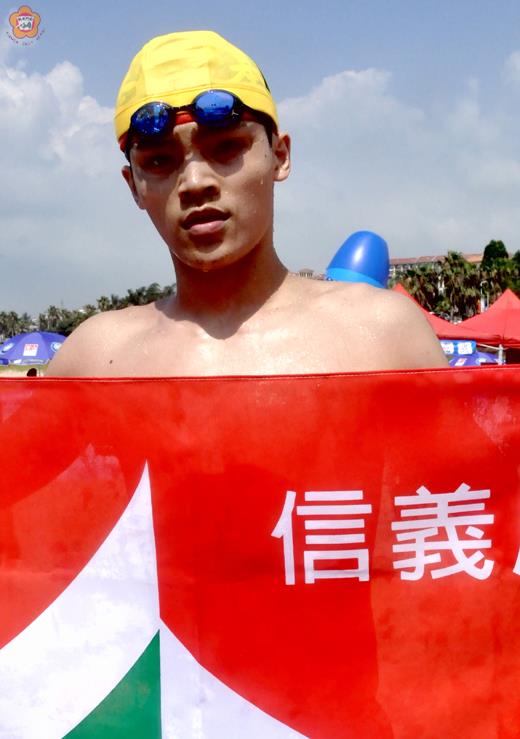 雖失「第一」,不失「信義」! 去年在金廈海泳拿下第一名的臺灣泳士鄧宇恩(1995.5.27)今年再度參賽;雖然沒有游出第一,但仍為他所代表的「信義房屋」揚旗傳名,堅持到底。