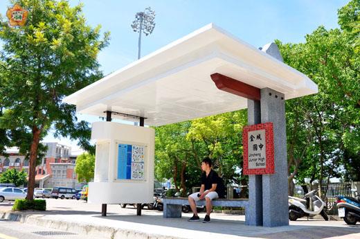 車船處「金門縣公車候車設施設計競賽」徵選出的冠軍候車亭正式於金城國中前路段啟用,亮眼的造型、新穎的結構,結合金門傳統閩南建築印象獲得不少民眾好評,但原有的雨水蒐集系統、LED燈泡、公車資訊看板及澆水系統等設計元素卻被省略配置,讓原創設計得獎人李旻桓甚感遺憾。 對於原創者的看法,車船處處長許一傑回應表示,該候車亭構工前曾與專業設計師討論過,雖然原創者的構思很好,但礙於工法的施作技術,材質的選用或取捨難免會有落差,這是理論與實務上差距,因此車船處才會在調整後建置現有的候車亭。 根據李旻桓的設計理念,這座新式的候車亭靈感來自於金門傳統閩南式建築與濃厚的人文風情,因此他在競圖比賽的設計概念中,以創造優質候車環境並兼顧低碳理念為題,以「解構」方式重新詮釋傳統閩南式建築與現代建築的關係,設計出這座候車亭。 原案得獎的規劃設計中,以「舊」與「新」元素混搭構成候車空間,因此特別選用金門傳統閩南建材之一的花崗岩、煙炙磚(燕子磚)及木料,並轉化馬背、旗竿座及斗栱等傳統建築語彙作為「舊」元素之展現;再以現代建築常用的FRP、鋼材及玻璃,並透過懸與不安定的手法營造「新」的現代感,揉合兩種元素呈現候車亭之美。 值得一提的是,為了響應金門低碳島的概念,當時他競圖比賽還設計夜間照明的LED燈光、管理者收納空間、公車資訊看板,以及屋頂雨水收集、雨水收集管線和貯水槽,行人透過外部即可看見貯水槽中的蓄水量,再運用水龍頭提供水源及民眾澆花或洗手,但可惜的是在此次完工的候車亭中,這些相關設備均被省略,無法發揮候車亭的多功能用途。