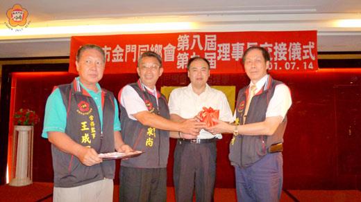 台南市金門同鄉會十四日上午舉行第八、九屆新舊任理事長交接典禮暨新任理監事就職儀式,來自台灣各地及金門的貴賓人數眾多,嘉賓雲集,充份顯現出創立二十年的同鄉會人氣豐沛。 卸任理事長王泉尚,熱愛家鄉,熱心同鄉服務工作,由於擔任基層里長公職,公務俗事羈身,分身乏術,故推薦常務理事陳慶才接任參選。而陳慶才長年服務基層勞工,嫺熟勞工業務與法規,又有中正大學勞工研究所碩士學歷,堪稱學有專精,獲得全體理事的肯定與支持,榮膺理事長一職。 縣府駐南區服務處主任蔡忠盼,當日一早會同屏東同鄉會理事長陳禮智、副總幹事王天賜及多位理監事,前往屏東內埔龍泉新兵訓練中心探視入伍金門子弟,關心入營情形。待探訪結束後,隨即趕至台南台糖長榮酒店會場,代表縣長李沃士向陳慶才祝賀當選理事長,並祝該會會運昌隆,鄉親服務工作順順利利。 交接典禮當天早上台南市大雨滂沱,但卻擋不住熱情的旅台鄉親前來參與盛會,計有新北市金門同鄉會祕書長張國森、金門烈嶼公共事務協會會長孫國欽、中華金門旅台公共事務協進會常務理事許丕平、桃園金門同鄉會理事長戴德滿、金門珠浦許氏宗親會理事長許清安、台中市金門同鄉會理事長周壽海、台中市浯江金門同鄉會理事長王展文、彰化金門同鄉會理事長莊煒煌、台南縣金門同鄉會理事長蔡忠盼、高雄市金門同鄉會??理事長翁明祺、高雄市浯江金門同鄉會理事楊維居及常監陳美金、屏東縣理事長陳禮智及多位理監事。另外民意代表則有來自金門家鄉的立委楊應雄,台南市立委陳淑惠,台南市議員林美燕、曾培雅、蔡旺詮。而台南市民政局主任祕書陳仲杰則代表市長賴清德出席盛會,熱鬧場景,讓旅外的金門人鄉親特感溫馨與光榮。