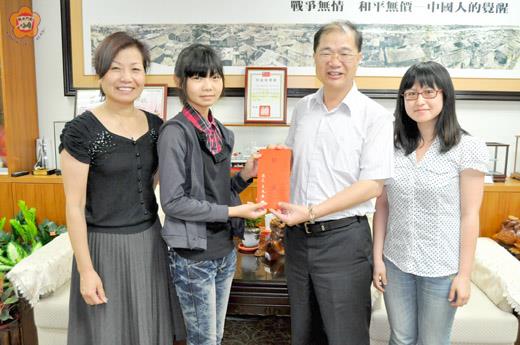 今年夏季開學新學期,即將升讀國二的金城國中同學李佳珍,出悌入孝,善良又懂事,是媽媽的好女兒,弟弟心目中的好姊姊,在學校是努力求學的好學生。在學校師長推薦之下,李佳珍獲得一百零一年全國孝行獎殊榮,將於二十日赴台領獎和接受公開表揚,縣長李沃士昨日親自接見,並致贈程儀壯行,也勉勵她在逆境中力求上進,完成未來當一位白衣天使的夢想! 家住金城鎮的李佳珍家境清寒,她的父親於前年病逝,全家生計靠母親在一家商店上班工作維持,還定期寄錢給外公外婆生活。李佳珍體諒媽媽的含辛茹苦,養育她和弟弟;於學校放學後,李佳珍回家第一件事,即是幫忙收拾洗淨衣物,幫弟弟檢查聯絡簿和功課,等媽媽下班返家做最後檢查,是一位懂事貼心的好孩子。 李縣長於昨天上午九時,在縣長室親自接見李佳珍,恭喜她榮獲今年全國孝行獎,相當的難能可貴;李縣長勉勵李佳珍說,在人生成長過程中的逆境,是一種磨練的機會,也可激發心志、努力求進。同時,李縣長致贈程儀一份,為李佳珍加油打氣! 李縣長也感謝老師翁雅欣細心給予李佳珍人格的輔導,尤以在青春發育成長階段,師長的關懷和解惑是很重要的。翁雅欣說,李佳珍在校是老師的好幫手,乖巧懂事,力求學業好成績,電腦、手工藝和美工都很拿手,在國一上學期參加校內簡報初賽,她與同學組隊參加,拿到國中第一筆獎金,開心的告訴謝媽媽,分享得獎的喜悅。 李佳珍接受訪問說,她未來會努力讀書,希望將來擔任護士,如果媽媽身體不好時,也可以照顧,並完成爸爸「照顧更多的人」的心願。家境不是很好,體會媽媽的辛勞,李佳珍說,會把錢都交給媽媽處理,也完成爸爸的心願!