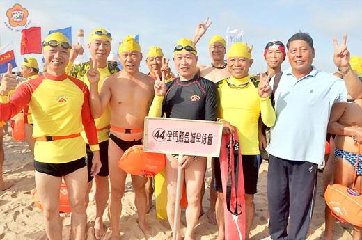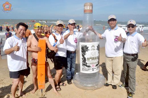 「二○一二年搶灘料羅灣-第十屆金門海上長泳」昨日上午八時起假八二據點舉行,來自兩岸各地八十四支隊伍,一千七百一十九名泳士乘風破浪,挑戰三千公尺的海上長泳。縣長李沃士表示,十年了,感謝每位泳士熱情參與創造歷史,締造個人的紀錄,祝福大家創造成功、創造幸福,明年再見。 「二○一二年搶灘料羅灣│第十屆金門海上長泳」吸引八十四支隊伍參加,活動昨日上午八時登場,現場貴賓雲集,縣長李沃士、僑務委員會副委員長任弘、教育部專員李昱叡、中華成人泳協總會長劉建廷、新北市市議員陳明義、國立體育大學校長高俊雄、金門大學校長李金振、香港泳渡選手領隊司徒秉衡、澳門泳度選手領隊許國華、金門縣副縣長吳友欽、主任秘書盧志輝、金湖鎮鎮長蔡西湖、金沙鎮鎮長陳昆第、金城鎮鎮長石兆日、金寧鄉鄉長陳成勇、烈嶼鄉鄉長洪成發、金酒公司董事長李文選、金酒廈門公司董事長楊文智、維他露公司副總經理莊正祿以及各組工作人員等與會。 縣長李沃士致詞時表示,金門海上長泳活動已邁入第十年,天公作美,風和日麗,感謝各界熱情參與,為活動創造歷史,替個人締造紀錄,並要感謝金酒、維他露等企業之贊助,讓活動愈來愈盛大。祝福每位泳士創造成功、創造幸福,就像今年最資深夫妻檔林瑞三、陳玉枝參與的精神一樣,明年繼續成長。 僑務委員會副委員長任弘表示,敬佩金門縣政府十年來與各界泳士們創造一個非常好的活動。今日海浪不小,泳士們順勢出發,逆勢而回,萬般起頭難,衝破難關就有順風的時刻,祝福大家乘風破浪、搶灘成功。 今年邁入第十年的搶灘料羅灣金門海上長泳活動,自九十二年起,年年舉辦從未間斷,儼然已成為兩岸各地泳士每年夏天最期待的海上長泳活動。今年共計有八十四支隊伍報名參加,其中有十一支隊伍來自大陸,更有香港及澳門游泳同好也組隊共襄盛舉。根據大會統計,台北南港愛心志工救生會,以一○三人位居本屆報名人數之冠,金門地主隊金城早泳會則以八十三人居次,昨日雖然風浪頗大,一千七百一十九名泳士,成功挑戰三千公尺海上長泳。 今年海上長泳活動,不只有高齡夫妻檔與會,也不乏老兵藉活動舊地重遊,曾是金門兩棲蛙人部隊一員的新北市議員陳明義,也藉此返回駐地憶當年。除了在地許多喜好游泳的民眾,連續十年報名也搶灘成功外,包括桃園縣大園鄉四季早泳會的劉萬等、張新龍,中華成人游泳協會的謝明豔等也從未缺席,獲大會頒獎肯定。 料羅灣上演一千七百一十九名泳士搶灘戲碼,岸上也不得閒,現場除規劃園遊會供與會民眾體驗外,在縣府精心安排下,地方才藝團體及學校可說精銳盡出,北門社區祥獅獻瑞、開瑄國小二十四節令鼓、多年國小獨輪車、金鼎國小扯鈴、中正國小鼓吹隊、古城國小獅鼓陣、金沙國中腰鼓陣、述美國小跳鼓陣、鳳翔社區搖旱船、金沙國小鑼鼓隊、COMBUY電音三太子、金沙婦女會腰鼓陣等,用精湛的演出令泳士和遊客眼睛為之一亮。 「二○一二年搶灘料羅灣-第十屆金門海上長泳」昨日上午八時起展開,歷時三小時,於上午十一時許畫下句點。今日上午,接續有來自台灣、大陸、香港、澳門一百五十四位選手將自小金門雙口海灘出發,泳渡金廈。