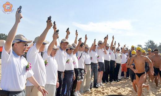 由金門縣政府與廈門市人民政府共同主辦的2012金廈海域泳渡│全球華人接力公開賽,昨日在小金門雙口海灘舉行熱鬧開幕典禮,由金門縣長李沃士等人主持鳴槍下水,參賽泳士即刻奮勇衝入大海,朝終點站椰風寨游去;映著燦爛的陽光和湛藍海水,選手鮮艷的桔紅色泳帽及救生汽球,以及濺起的層層浪花,構成一幅美麗畫面,岸上觀眾也為泳士加油,祝他們泳出成功、及泳出兩岸和平、繁榮、幸福。 今年堂堂邁入第四個年頭的金廈海域泳渡接力賽事,總共有來自兩岸四地七十六支隊伍、一百五十二位菁英泳士參加,以「兩人一組」的接力方式,在海上乘風破浪合力挑戰長約七公里的海上長泳,比泳技、比體力,也比耐力和團隊合作精神,並象徵金廈兩岸在未來「接力合作」共創雙贏。 參與金廈海泳活動選手及工作人員,在昨日上午六時三十分一大早,即由大金門搭交通船來到與廈門遙遙相望、僅一水之隔的雙口海灘,受到烈嶼上岐國小大鼓隊的熱情歡迎,並展開通關。接著,上岐國小大鼓隊也表演「十足幹勁·鼓動浯洲」節目,南塘社發會真武電音三太子也帶來「心手相連·電翻小金」的精彩演出,為泳士鼓舞士氣。 金廈海域泳渡開幕典禮於昨日上午八時熱鬧舉行,由縣長李沃士主持,僑委會副委員長任弘、監察委員周陽山、典試委員胡幼圃、烈嶼鄉長洪成發、金沙鎮長陳昆第、金寧鄉長陳成勇、烈嶼鄉代會主席洪若珊、成人泳協會總會長劉建廷,以及廈門市體育局長余振杰和副局長傅曉春、廈門廣電總經理張思杰等人參加觀禮,並為泳士選手加油,祝福泳向成功! 縣長李沃士、烈嶼鄉長洪成發、廈門市體育局長余振杰等人,共同為金廈海泳鳴槍開賽;當槍聲響起,參賽泳士立刻奮勇衝入大海,前仆後繼,朝終點站椰風寨前進,伴隨著激起陣陣的浪花,映著燦爛的陽光和湛藍海水,選手鮮艷的桔紅色泳帽及救生汽球,構成一幅海上美麗的畫面,岸上觀眾也為泳士加油,祝他們泳出成功、及泳出兩岸和平、繁榮、幸福。