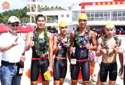 福建省游泳跳水管理中心運動員張子彬、姚日含;雷珊、楊丹丹,包辦第四屆金廈海峽橫渡活動男、女組的冠軍;臺灣暖暖高中的邱思輯、羅寯;鄧羽彣、蘇詩涵也游出男、女組的第三名。金門縣長李沃士特別在終點站迎接前三名泳將,並和廈門來賓一同開香檳向泳將們道賀。 李縣長稱許泳士們的好泳技和十足耐力、體力,一起完成超過7100公尺的泳程,成功挑戰金廈海域的壯舉,也是人生最寶貴的游泳紀錄。 李縣長也和(左起)大陸選手韓櫟都、沈梟傑、姚晗、以及台灣選手羅寯合影,讓泳士們感受到兩岸主辦單位的重視、享受到勝利的驕傲,也印證平日訓練的甜美果實。