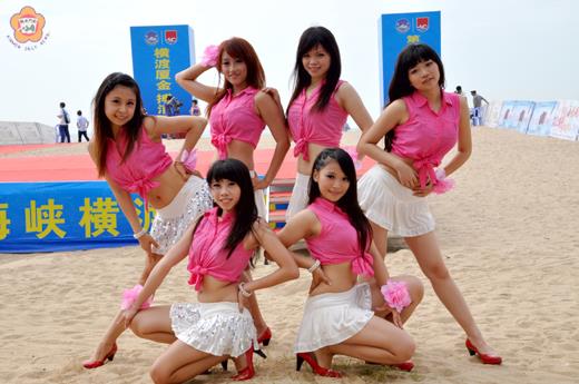XKC搏浪共歡;KDC美在金廈! 由李依文(後左一)率領的KDC金門舞蹈團昨天在第四屆廈金海峽橫渡活動(XIAMEN-KINMEN CROSSING)演出,成了會場的嬌點與焦點。她們表演的舞蹈有美式啦啦舞、新潮爵士舞等。 K女郎們為了能有最好的演出效果,前天就先由金門經由小三通管道進駐廈門,在椰風寨排演,並且應遊客的要求,一再大秀海灘舞,成為金廈交流最美的景緻之一。