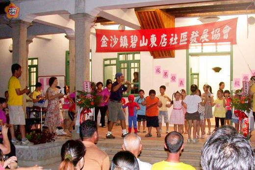 睿友學校第一次成果發表會,五個班,七項演出,吸引碧山及鄰近社區老中青三代與會,兒童美語幼兒班學員開場炒熱現場氣氛,也展現八堂課的成果;土風舞演出,台上台下一起手舞足蹈,好不熱鬧。 碧山東店社區發展協會,四月十四日起接手管理由文化局修復完成對外開放的睿友學校,並且於夜間開設各類學習課程,邀請民眾一同到睿友學校上學,經過八堂課的學習,七月六日告一段落;第一次成果發表會,居民動員參與,別具意義。 睿友學校第一次學習課程,共計有兒童美語(幼兒班及美語B班)、管樂班、太極拳、土風舞、瑜伽,於週一至週五夜間七時三十分假睿友學校授課,張志源、張翠敏、李瑞鸞、陳國琍、張雲萬、李秀羨等義務指導,日昨分別率領各班輪番上陣秀成果。 透過美語班,讓許多不識字的孩童,從遊戲和體驗中輕鬆學習;太極拳、瑜伽課程表演也讓居民眼睛為之一亮,更重要的是全村老中青三代齊動員參與,展現也見證八堂課的學習成果;有民眾說,不少人參加免費課程,透過舞蹈和運動改善了糾纏已久的病痛,真是一舉兩得。 碧山東店社區發展協會理事長陳國琍指出,感謝文化局對縣定古蹟睿友學校修復的用心,讓社區能有一場如此別開生面的成果展。而碧山古有金東之珠的美名,期待透過社區居民的努力,展現熱情與活力,讓政府單位不要忘記碧山睿友學校的存在,更讓碧山能再次成為金東地區社區營造的亮點。 社區志工隊長陳美玲表示,希望日後能爭取機會,讓社區媽媽走出去秀才藝,展現此次學習成果,獲得更多肯定。 最後,由理事長陳國琍頒發感謝狀給義務指導的老師,並頒獎給表現優異的學員,活動在樂聲、掌聲中畫下完美的句點。
