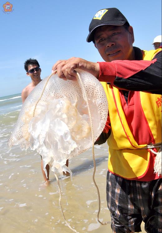 水母大大個,遊客嚇嚇叫!成功海邊的沙灘上,遍布著略大於硬幣直徑的水母;為「夏豔海洋風」活動示範牽罟的漁民昨天則網到了約為籃球直徑大的水母,讓圍觀者嚇嚇叫-又愛目睹,又怕有毒! 根據相關報導,水母是大型浮游生物,牠們的祖先出現得比恐龍還早。水母的觸手和身體的刺細胞,可以分泌毒素,麻痺獵物;在海水浴場中,水母常對遊客造成傷害;不過,也有些水母是無毒的。 大部份水母都有三個主要部份:圓傘狀或是鐘狀的身體、觸器和口腕。水母體內有百分之九十五是水,百分之三是鹽,百分之二是蛋白質;牠們並沒有心臟、血液、鰓和骨骼。 這隻水母不知有毒無毒,牠後來被一位年輕的媽媽抱向海中放生-雖然漁民說牠可以用來做海蜇皮。