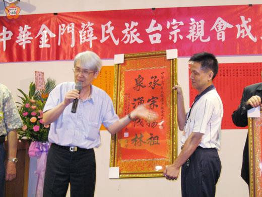 金門旅台第二十五個同鄉、宗親社團「中華金門薛氏旅台宗親會」,昨(八)日在新北市中和區狀元樓餐廳舉行成立大會。兼任福建省主席的政務委員薛承泰五弟薛承泉獲選為理事長。 薛承泰主席、張慶忠立委、新任的福建省政府秘書長侯全寶、金門縣政府社會局長方天吉、旅台各金門同鄉會理事長等貴賓出席昨天大會,與百餘位薛氏宗親見證金門第二十五個旅台同鄉、宗親社團的誕生。 薛主席致詞表示,旅台薛氏宗親過去以聯誼性質已運作很久,這次正式向內政部報准成立,他盼望有更多的薛氏宗親加入這個鄉親團結象徵及傳承指標的宗親會,也把鄉親更團結在一起,相互關心照顧。 獲選為正式成立的「中華金門薛氏旅台宗親會」首屆理事長的薛承泉,是薛承泰主席的五弟。薛主席把親自書寫的「承宗楊祖、泉湧茂林」道賀中堂遞交給五弟,薛家大哥薛承輝〈台大教授〉也在場,兄弟三傑,成為會場焦點。 金門縣政府社會局長方天吉致詞,他代表在金門主持夏艷海洋風│花蛤季系列活動的李沃士縣長向在座薛氏宗親與來賓問候,也盛讚薛氏宗親人才輩出,充分展現血濃於水的鄉親情誼。 薛氏旅台宗親會登記會員一百六十人。昨天選出常務理事:薛祖岳、薛肖觀、薛天宋、薛祖平。理事:薛芳裕、薛祖語、薛永波、薛祖仁、薛榮華、薛作伍、薛永年、薛承鎮、薛文華、薛永志。常務監事:薛亞賞。監事:薛朝勇、薛建恆。 金門縣政府台北服務處主任陳永富表示,中華金門薛氏旅台宗親會正式成立後,向金門縣政府社會局報備在案的金門旅台同鄉、宗親社團總共有二十五個,分別是:台北市金門同鄉會、新北市金門同鄉會、桃園縣金門同鄉會、新竹市金門同鄉會、台中市金門同鄉會、台中市浯江金門同鄉會、南投縣金門同鄉會、彰化縣金門同鄉會、台南市金門同鄉會、台南縣金門同鄉會、高雄市金門同鄉會、高雄市浯江金門同鄉會、屏東市金門同鄉會、台東市金門同鄉會、花蓮縣金門同鄉會、宜蘭縣金門同鄉會、基隆市金門同鄉會、中華金門同鄉會、中華民國烈嶼公共事務協會、中華民國雙鯉公共事務會、中華金門旅台公共事務協進會、桃園縣金烈鄉親公共事務協會、中華民國珠浦許氏宗親會、中華金門旅台翁氏宗親會、以及剛成立的中華金門薛氏旅台宗親會。