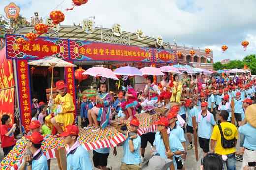 擁有六百二十五年歷史之久的金門城古地城隍廟,昨天下午舉行聖誕千秋繞境巡安慶典,境內神尊輦駕在信徒的簇擁下繞巡四門境,祈求國泰民安、風調雨順,金城地區的四門境也出動前往逗熱鬧,金門城村內可是人山人海、鑼鼓喧天,沉浸在一片宗教慶典的歡樂氣氛中。 古地城隍聖誕千秋巡安慶典是在昨天下午二時正式登場,繞境儀式開始前,來自金門城境內的各神尊輦駕等陣頭在古地城隍廟廣場前大秀陣頭技藝,古城國小更是以鑼鼓陣技驚四座,醒獅團表演更是掀起展演高潮,舞獅陣在校內師長的協助下,站上二層樓高的竹竿上,再從獅口吐出慶賀紅綵,贏得現場觀眾的熱烈喝采! 隨後,城隍爺神尊在金門城鄉老陣頭的隨行下,依序沿著金門城的西門、北門、東門、南門四門境展開繞境巡安儀式,來自金城四境的跑旱船、公揹婆、十二婆姐、鑼鼓陣等陣頭也到場共襄盛舉,吸引當地居民爭相觀賞,整個金門城可說是神氣十足、熱鬧滾滾,而遊行隊伍繞經各宮廟廣場前群起的鞭炮煙火,更增添繽紛熱鬧的迎客喜氣。 陣頭在途經各境時,許多地區民眾也在門前擺上香案、虔誠祈福,或是奉上涼茶飲料慰勞遊行隊伍參與人員,整個繞境行程約在下午六時許結束,金門城當地的居民也在晚間熱烈邀請賓客宴席,在自家享用祭祀後的菜餚,或至古地城隍廟前欣賞戲曲演出,為繞境巡安慶典劃下句點。
