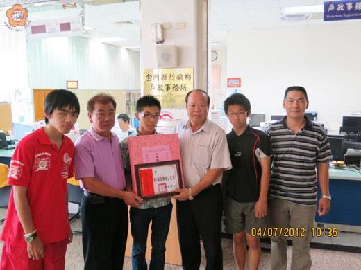 烈嶼鄉喜訊,烈嶼鄉於昨(四)日設籍人口數突破一萬人,第一萬名幸運兒為烈嶼鄉的旅台鄉親羅一棠,昨日烈嶼鄉長洪成發特前往祝賀並致贈紀念牌,同時金門酒廠也為慶祝烈嶼鄉人口破萬,特致贈高粱酒。 昨日上午約十時許,羅父羅勝材前往烈嶼鄉戶政事務所,為其三位兒子老大羅一宏、老二羅一棠及老三羅琳淵辦理戶籍遷移手續,欲將其戶籍由台遷回烈嶼鄉,其中老二羅一棠意外成為設籍烈嶼鄉的第一萬名鄉民的頭銜,當場受到烈嶼鄉公所暨戶政所所有同仁齊聲慶賀。 洪成發在聞訊後相當高興,為慶祝烈嶼鄉民突破萬人,特前往羅家向其父道賀,並頒贈羅一棠紀念牌乙面、紅包兩千元及紀念品,另金門酒廠聞訊後也致贈高粱酒一瓶表示祝賀之意。羅父並表示說,對於這份意外之禮,雀躍不已,家鄉空氣好、治安好,生活環境品質最適宜人居住,未來也將考慮讓其兒子在家鄉接受教育。