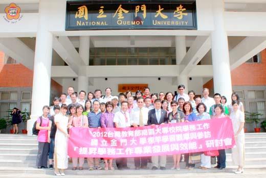 南區大專校院學務長一行前抵金門大學召開「提昇學務工作專業發展與效能研討會」,進行學務工作標竿學習觀摩參訪,深入了解金門大學處於具有特殊民俗文化的戰地金門所積極推動各項教育與學務工作的特色與深耕成果,並盡情體驗金門的戰地文化風光。 南區大專校院學務長與學務同仁一行近40人在南區大專校院學生事務工作協調聯絡中心召集人國立成功大學林啟禎學務長帶領下,於日昨前進金門大學辦理為期三天的「提昇學務工作專業發展與效能研討會」,進行學務工作標竿學習觀摩參訪,金大校長李金振親自帶領學生事務處董燊學務長暨學務處全體主管接待歡迎。 李金振校長指出,出席的學務長來自30所南區大專校院,超過南區大專校院的一半蒞校參訪與指導,讓該校師生備感驕傲與榮幸,也代表南區大專校院的向心力。 他說,金大的學生80%來自台灣,大約294所高中,每年招收1200為新生,逐年增加,也逐步地開放招收大陸學生。然而第一年的試辦招收大陸學生並沒有很成功,因為大陸學生的目標大多放眼在跨越台灣海峽的本島,尤其以北部為主,這部分該校還有很大的努力與成長空間。也非常感謝教育部優惠金門大學,優先開放該校大學部可以招生陸生,而且名額外加。未來勢必也會逐步開放,該校將更加緊腳步,紮穩基礎、做好準備。 他也歡迎來金的南區大專校院學務長與學務同仁在金大學務長董燊全程陪同引領下,深入了解處於具有特殊民俗文化的戰地金門所積極推動各項教育與學務工作的特色與深耕成果,以及金大對於金門島的在地關懷、共享共榮,將金門打造為一個高等教育大學島,同時也扮演台灣與大陸兩岸之間一個溝通與交流的重要橋樑的努力辦學願景。 南區大專校院學生事務工作協調聯絡中心林啟禎召集人代表全體與會的學務長與學務同仁,感謝金門大學李校長、董學務長及全體學務處同仁的熱情接待與費心安排觀摩參訪行程。 此次研討會也安排有成功大學醫學院行為醫學所郭乃文教授之「學務工作中的全腦潛力開發—從大腦功能討論顯性課程與隱性教育之意義」之專題講座,以及國立高雄應用科技大學黃世疇學務長「學務工作實務案例經驗交流分享」與遠東科技大學蔡文彬學務長之「教育關懷與弱勢照護—以遠東科大為例」之學務工作實務經驗交流。同時,也安排規畫金門戰地文化—擎天廳參訪與在地民俗文化采風交流活動等。
