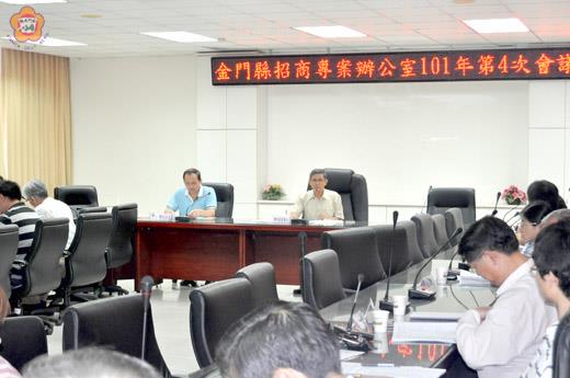 金門縣招商專案辦公室一百零一年第四次會議昨日召開,由副縣長吳友欽主持,並聽取各次會議結論執行情形報告,以及縣府招商案件進度提報;吳副縣長對於小金門為離島中離島,小金門鄉親希望導入觀光人潮,帶動商機活絡,希望交通旅遊局對於雙口海岸招商規劃案在土地取得能與招商專案辦公室協助解決,以讓距離廈門近的小金門突破困難,成為招商亮點。 吳友欽也以金門土地飛漲,古寧頭興建住宅案為鄉親所期待很重要案子,是希望建設局就低碳島綠建築概念能導入;而在目前為金門發展關鍵時刻,備受海內外關注,在招商引資案土地問題是一切根本,縣府團隊對於關鍵案子更要集中力量來克服困難,以突破幾個點,招商案就能更順暢推動。 金門縣招商專案辦公室第四次會議昨日上午九時十分起,在縣政府第一會議室舉行,縣府局室主管和相關機關主官、金門縣工商發展投資策進會總幹事蕭永平及招商專案辦公室總顧問葛賢鍵博士、金酒公司代表等與會。 會中,與會人員聽取歷次會議結論事項辦理情形與檢討、招商專案辦公室工作報告、招商總顧問工作進度報告,及啟案單位就已招商案件進度(金門縣工商綜合園區、金湖鎮商務旅館案)報告與檢討,以及由各單位針對十三案招商專案工作進度進行報告與檢討。 吳副縣長對於繼續列管項目,希望各單位積極推動和落實辦理成效。 十三案招商案件,包括:財政局的莒光湖商務旅館開發案。建設局的金沙綠能產業專區、古寧頭興建住宅案。交通旅遊局的溪邊濱海休閒渡假村、銅牆山營區(觀光遊憩)、金門國際觀光旅館(伯玉亭風景區)、乳南二營區轉化再利用、雙口海岸招商規劃案。衛生局的中山林段產業專用區。港務處的水頭國際港經貿園區。林務所的金門縣綠色休閒渡假園區。文化局的金門影視城。金酒公司的金門酒廠擴建土地。 昨會中,也針對金門風獅爺渡假村、泰偉金門工商綜合區、金門深層地熱發電實驗性計畫等三項民間參與重大投資案件進行進度報告與討論。 總顧問葛賢鍵指出,金門縣希望將陸資招商部分,因大陸國企等受限於網際網路與新聞公告等發布的實務操作,難以直接進入金門縣;因此,協助金門縣建立與陸資招商之互動平台、雙方交流互動、資訊發布,為積極努力重點目標。並提醒縣府對民間參與重大投資案,應深入了解掌握,以免有「空投」情事的發生。