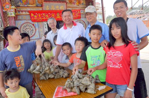 張建騰/圖文 「重五」日,包肉粽;重衛教,保牙齒! 昨天是農曆五月五日端午節-又稱重五或重午,尚義社區的包粽活動結合了衛教宣導,透過有獎徵答的方式,希望社區的孩子們重視口腔衛生及保健。 立委楊應雄(後右三)、金門縣長李沃士、金湖鎮長蔡西湖等,都曾到尚義社區賀節;社區發展協會理事長黃乃增對他們表示感謝,因為社區在他們的協助下,增加了許多建設。