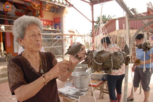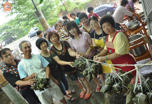 颱風來襲、包粽備糧!金城鎮珠山社區發展協會昨舉行端午節2012壬龍年端午「包粽、包中、粽飄香」活動,19日提前在颱風來襲前召集居民慶祝端午。下午二時許,婆婆媽媽們準時在珠山大道公宮前集合,備妥粽葉、糯米等材料展開包粽工作,村民們開玩笑的表示,颱風來臨若家裡沒有備糧,包好的粽子剛好可拿來裹腹,作為颱風假期的戰備存量使用。此言一出,讓現場包粽社區居民們會心一笑、頻頻點頭稱是。