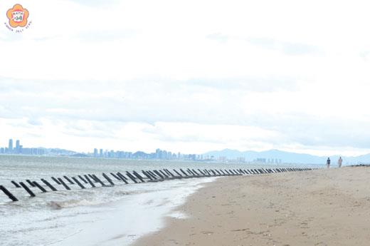 泰利颱風來襲,金門昨日凌晨起下大雨,上午仍有間歇性雨勢,雖然一度出現陽光,但下午風勢轉強,慈堤海岸邊仍有零星遊客,在觀景平台賞景或於沙灘上漫步。 天空漸多的烏雲飄渺,遠眺對岸高樓林立,金門的軌條砦依舊橫插沙灘地,只是颱風來襲,連討海人也不見了,留下的是這幅海天不同色、風雨欲來的畫面。