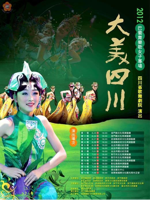 一項由金門縣政府與台省各縣市共同主辦的巴蜀舞樂歌「大美四川」女子專場,將於明(廿三)日及廿四日,假金門文化局演藝廳登場,由來自大陸四川省歌舞劇院擔綱演出,將帶來漢、藏、羌、彝族舞蹈,精彩可期,歡迎鄉親逗陣共賞一齣極具觀賞性、思想性、藝術性合一的晚會! 合辦單位金門文化局表示,四川省歌舞劇院來台演出,率先在明日及廿四日下午七時三十分至九時,演出兩場巴蜀舞樂歌「大美四川」女子專場;之後,將於六月廿七日至七月八日,分別巡抵澎湖縣、台北市、新竹市、彰化縣、苗栗縣等縣市演出,藉由「四川省歌舞劇院」巴蜀舞樂歌女子專場的舉辦,希望藉此活動,能充實國人生活內涵、培養藝術之鑑賞力,並促進民族之融合、交流與互動,活絡地方文化,提昇民眾文化水準。 巴蜀舞樂歌「大美四川」女子專場將以鮮明的民族特色、獨特的民俗風情、深厚的巴蜀文化為根基,用漢、藏、羌、彝及古典詩樂舞樂的形式來呈現,豔麗大氣,時尚現代,特色鮮明。特別是近五十名靚女的激情演繹,使整齣演出蓬蓽生輝,高潮迭起,予人以美的享受,是一場視覺的盛宴! 四川省歌舞劇院代表四川鮮明地方特色、民族特色和最高藝術水準的國有藝術表演團體,將為金門鄉親帶來漢族舞蹈《百花爭艷》、古典舞蹈《竹枝詞》、藏族舞蹈《溜溜情》、川劇高腔《遊園》、漢族舞蹈《雨巷》、藏族舞蹈《紮西德勒》、摩梭族舞蹈《瀘沽湖畔》、民俗技藝《茶技薈萃》、羌族舞蹈《孜姆蘭巴》、彝族舞蹈《呼喚綠蔭》、古典舞蹈《茶倌》、漢族舞蹈《看戲》、彝族舞蹈《節日盛裝》、戲曲古典舞蹈《俏花旦》。 金門文化局歡迎鄉親踴躍前往觀賞精彩演出,也提醒基於對與會觀眾及演出者的尊重,並共同營造友善藝文欣賞環境,維護大部分參予者欣賞藝文權利,演藝廳內禁止吸煙和飲食,觀賞演出時最好將隨身攜帶之鬧表、手機及其他相關電子用品暫時關閉,也儘量減少在演出進行中交頭接耳的交談與走動等干擾演出之行為,另演出期間燈光較暗基於安全考量也請留意身旁的小朋友。