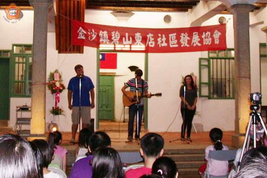 碧山東店社區發展協會端午節活動很不一樣,上午婆婆媽媽齊聚睿友學校包粽慶祝,晚間七時三十分起則當觀眾欣賞音樂會。來自美國的教會樂團「Before the Story」(故事之前)到睿友學校演出,為期一個多小時,獻唱多首動人的歌曲,讓一百多位鄰近聚落鄉親,享受一場特別的音樂饗宴。 碧山東店社區發展協會理事長陳國琍表示,在兒童美語班老師的牽線下,有請來自美國的教會樂團「Before the Story」(故事之前)到睿友學校演出,讓居民度過不一樣的端午節。 該樂團成員來自美國不同州,在大學成了朋友,因為彼此對音樂很有興趣而組團,屬教會樂團,在美國的許多教會、學校、婚禮中分享過美妙樂章,雖然自己也有創作,但目前還未錄過CD。昨日在睿友學校為一百多位金門鄉親獻唱十來首歌曲,包括「Like a lion」、「I can」t get over you」以及多首西洋流行歌曲等,優美的歌聲令民眾聽得如痴如醉。