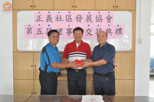 正義社區發展協會昨舉辦第五屆理事長交接典禮,由新任理事長陳水義接任,金湖鎮鎮長蔡西湖並到場負責監交。陳水義在就任致詞時期許能夠團結社區老中青一起為社區發展而努力。 這項交接典禮於昨日下午二時三十分假正義里辦公處二樓舉行,現場除正義社區發展協會各理事成員外,鎮長蔡西湖也到場進行監交。蔡西湖致詞表示,正義社區這幾年的發展在地方上是有目共睹的,他相信在新任的理事長帶領下,社區定能更加茁壯,未來社區若有任何需求,公所定當竭盡所能盡力協助。 新任理事長陳水義致詞時表示,未來上任後,會致力於讓社區更健全化,團結地方老、中、青三代的力量,讓社區更加茁壯,也盼望鎮長對社區的發展鼎力相助,日後他希望能在各理事支持輔佐下,會致力為里民與社區發展而服務。 第五屆正義社區發展協會由陳水義接任理事長一職,其他成員還有常務監事盧榮樑,理事有陳舜照、陳水潭、陳金城、陳森照、陳雲龍、陳金錠、陳國連、陳應龍、陳覺義、陳得興、陳前龍、陳詩平、陳志生、陳志龍,監事為陳木漳、陳進生、陳文亮、陳榮棟。