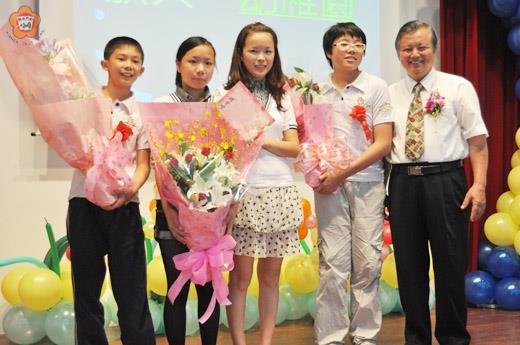 楓香大道,蟬鳴鳥叫及讀書聲,讓述美學子萬般懷念,昨日踏出校門前,畢業生感謝師長八年來的辛勤灌概,將會全力以赴迎接未來的挑戰。校長黃奕展勉學子在下一個學習旅程自動自發、主動學習;導師李宜嫻則要學生凡事要堅持並保持自信心;師生輪番上台秀才藝,畢業典禮別開生面,熱鬧滾滾。 述美國小昨日上午八時三十分起,假學生活動中心舉辦國小部四十三屆幼稚園第三十五屆畢業典禮,立法委員楊應雄、何浦校長李國安、柏村校長陳為學、安瀾校長楊肅正、督學陳為信等貴賓蒞臨,受到校長黃奕展及家長會會長楊能斌等熱烈歡迎。 畢業典禮中,除了頒獎給畢業生,更安排一系列表演節目,除了由各班擔綱演出外,今年更增加替代役、老師以及師生聯手內容,端出別出心裁的節目,讓與會貴賓眼睛為之一亮,宛若師生才藝秀,十分熱鬧。 英語教師謝宜庭與具小提琴專長的替代役翁迦恩,合唱英語歌「Moon River」獻給畢業生,祝福大家一帆風順;音樂老師王慈寧也和畢業生楊采妮透過四手聯彈獻藝,兩人彈奏電影配樂「路小雨」,讓師生聽得如痴如醉。另外幼中班的健康GO!GO!GO!精神抖擻,博得不少掌聲,畢業典禮師生連袂秀才藝,別開生面也熱鬧滾滾。 最後,全校齊唱校歌以及應景的畢業歌曲,在優美的歌聲中為一年一度畢業典禮畫下圓滿句點。