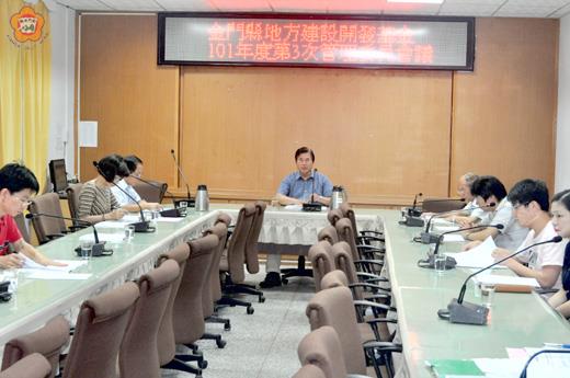 金門縣地方建設開發基金一百零一年度第三次管理委員會議昨召開,審議通過二件申請購屋貸款利息補貼案、一案申請民宿經營週轉金無息貸款案;另有兩案申請經營民宿暨民宿週轉金,是決議由申請者補各項明細再予核貸。 地方建設開發基金管理委員會議,昨日上午九時起,在縣政府第二會議室召開,由縣府主任秘書盧志輝主持,委員李再杭、黃景舜、李秀荷,以及建設局、工務局、政風室、民政局、交通旅遊局等代表與會。 會中,就五項提案進行審議,並通過二件申請購屋貸款利息補貼案、一案申請民宿經營週轉金無息貸款案;另有兩案申請經營民宿暨民宿週轉金,是決議由申請者補各項明細再予核貸。 縣府財政局也就金門縣地方建設開發基金一百零一年度五月三十一日止執行績效,提出向委員報告。