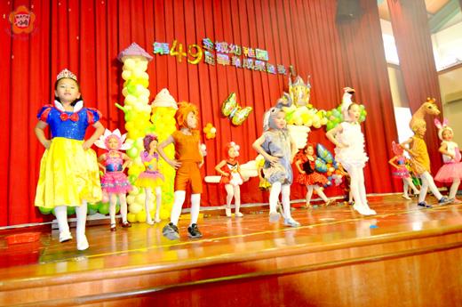 金城幼稚園昨日上午舉辦一場「第四十九屆畢業生成果發表會」,由畢業班兩百多位畢業生擔綱演出,以歌唱或舞蹈展現他們學習的成果,現場有多位學生家長擠滿會場,場面既溫馨又歡樂。 金城幼稚園於昨日上午九時五十分假該校活動中心舉辦「第四十九屆畢業生成果發表會」,將兩年來在園內的學習成果藉由歌舞呈現在師長及父母面前,許多的學生家長特地請假到場為孩子們加油,並紛紛拿著相機拍下小孩的台上精彩表現,一起見證自己孩子們的成長過程。 金城幼稚園園長盧淑惠說,「台上五分鐘,台下很費工」,城幼為了這場精采的演出,近日來校園處處充滿了歡樂氣氛,鼓聲齊鳴,樂歌勁舞,老師與畢業生們均用心練習,只為了帶給家長們耳目一新的感受。同時對於家長的踴躍參與相當感謝,她並認為家長們能在孩子的成長過程中不缺席,是相當重要的。 活動中,由大紫班的畢業生們打頭陣,以歡樂鼓舞開場炒熱氣氛,鼓聲震天展現小朋友們的活力,接著大黃班及大彩虹班的復古舞蹈與火焰之舞,曼妙舞姿博得滿場掌聲,而大粉紅班演出的經典童話│白雪公主,活潑可愛又逗趣,接著大紅班的旗鼓飛揚,展現他們的旺盛精力,另外大藍班與大桔班的迪士尼歌舞與原住民成長祭,載歌載舞十分歡樂,最後在大綠班演出的成長舞台,以感性的音樂為這場成果發表畫下完美句點。