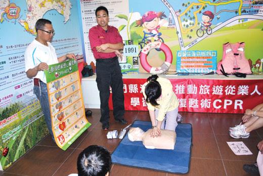 為因應地區小三通及觀光旅客增加,金寧消防分隊推動旅遊從業人員學習心肺復甦術(CPR),日昨開抵金門國家公園中山林自行車故事館展開,志工進行二小時之CPR教學並通過測驗,使其具備急救技術,俾於災難事故發生第一時間,給予傷病患適當急救處置,發揮自救救人功效。 隨著小三通開放及金門縣政府大力推動金門觀光,來金旅客大幅成長,歷來不乏旅客於住宿飯店內心肺功能停止或有其他極需救護處置之傷病患,金寧消防分隊為使旅客能於救護人員到達前能獲得必要之急救處置,特別推動旅遊從業人員(飯店、餐廳員工、風景區服務人員、導遊、計程車業者、遊覽車司機)CPR學習計畫,讓旅客能來金門旅遊時,獲得最佳的救護服務。 金門縣消防局規劃辦理旅遊從業人員學習新版心肺復甦術(CPR)急救訓練,日昨金寧消防分隊開抵金門國家公園中山林自行車故事館,由隊員許凱嵐、消防役林威廷、鳳凰志工吳啟榮對自行車故事館志工進行2小時之CPR教學,教學後並進行測驗,在大家認真學習及操作後,紛紛通過測驗,展現大家對於金門縣政府為提升旅遊服務品質認同之決心。 金寧消防分隊分隊長周柏彰表示:現行CPR口訣為「叫」、「叫」、「C」、「A」、「B」「D」。絕大部分的心臟停止發生於成人,且最高的心臟停止存活率一般見於發生(有人目擊的)心臟停止以及心室顫動(VF)或無脈搏心室性心搏過速(VT)初期心律的各年齡層病患。在這些病人中,最重要初步要素為胸部按壓和及早進行去顫(電擊)。大部分到院前心臟停止患者沒有接受到任何旁人CPR。此一現象的原因可能有很多,但其中一項阻礙可能是沒有學過CPR,或對其內容不甚了解而不敢施行CPR,在分隊針對旅遊從業人員推動CPR學習計畫後,希望讓更多人學會此一救人技術並在遇到事故時能及時發揮所學,及早搶救。 消防局長楊肅凱也呼籲金門鄉親,CPR不再侷限於針對自己親人,在工作或觀光場所等地均有可能遇上突發性心肌梗塞,如現場有人會操作CPR,在救護車來臨前能大幅增加存活率。目前各分隊都規劃一系列飯店、景點、餐廳、機場、碼頭、計程車排班場所進行CPR宣導,機關團體如需協助訓練可主動洽請各地消防分隊派員前往辦理CPR急救訓練。