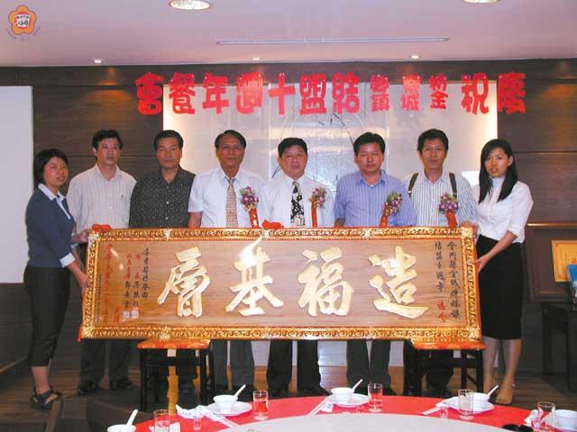 有朋自遠方來,不亦悅乎!為慶祝與金城鎮結盟十週年慶,屏東縣枋寮鄉公所組訪問團一行五十餘人昨由鄉長吳照雄、鄉代會主席鄭永章的率領下,拜會金城鎮公所暨鎮代會,受到鎮長蔡輝詩、鎮代會主席楊志人等人熱誠的接待歡迎,令來訪的嘉賓,感受到金門濃厚的人情味。 由枋寮鄉長吳照雄所率領的參訪團一行,成員有枋寮鄉代會、各村里長,及其眷屬等五十餘人。為慶祝兩鄉鎮結盟十週年慶,昨日抵金進行參訪,金城鎮公所也在金城葡京餐廳舉行慶祝活動,讓來訪的姊妹鄉感受到金門人的熱情。 會中,枋寮鄉長吳照雄、鄉代會主席鄭永章也特別將題有「造福基層」的匾額,贈予金城鎮公所,並由鎮長蔡輝詩、鎮代會主席楊志人代表接受,而蔡、楊兩人也回贈題有「情誼永固」的紀念牌,希望雙方友誼長久,場面溫馨。 蔡輝詩表示,自八十一年五月結為姊妹鎮的金城鎮與屏東縣枋寮鄉,十年來雙方交流頻繁,相互交換治鎮心得,讓地方建設更為進步,因此希望枋寮鄉常率團來金城走走交流聯誼,加強金城鎮與枋寮的交流互動,增進兩鄉鎮的情誼。 此外,前鎮長、鎮代會主席許金象、前鎮代會副主席陳泰明也一同參與這項慶祝活動,向遠道來訪的姊妹鄉訪問團致意,也竭誠歡迎他們的抵金參訪。