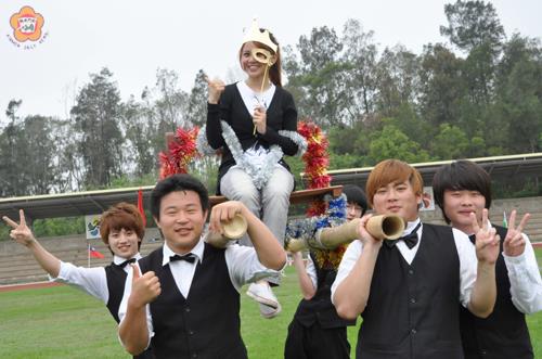 慶祝建國百年及獨立設校三十週年,國立金門農工昨天舉辦千人創意化妝遊行。遊行隊伍中餐館三的「力士」們用竹槓抬著扮成女皇的系主任出場;漁業一則開出了紙糊的「鐵達尼號」,由兩名男生演出船頭上搞笑版的經典抱抱。 在校慶活動中,金門農工舉辦了第二十三屆校運會;今年運動員是以千人創意化妝遊行的方式出場。 餐管三的「女皇駕到」是由陳致葳、陳柏丞、洪麟、王驤等充當舁夫,抬著打扮成女皇的系主任兼導師余佩荺遶場。 學校的人員說,余佩荺是全國最年輕的系主任。她所指導的餐管三活潑外向,在實習成績、證照考取上,都有很好的表現。餐管三的梁聖翊是全國孝悌楷模,也是創校以來,唯一拿到中餐乙級證照的學生。 漁業一「不沈的鐵達尼號」由紙張拼成的,可以推著走。學生黃柏睿模仿男女角「傑克」由後抱著陳厚志的豐腰而非蜂腰;陳厚志則扮演「蘿絲」,如展翼飛翔般張大雙臂,用搞笑版的鐵達尼經典之抱吸引了全場的目光。 漁業三的「十八銅人疊羅漢」疊成了人體蛋糕,由陳威佐秀出生日快樂的看板。 汽車二的「特戰奇兵」準備了「水火箭」,射向觀禮台;不過,有些「水火箭」 沒有按照目標往前射而是上下抖,反向彈,為射手自己及身後的同學灑下滴滴清涼。 家政一的「丑角」一出現就讓人覺得開心,由林君怡、江佳蓉所扮的小丑奔上司令台,獻上氣球冠冕向校長陳水芳致敬。這一班是學校的話劇特優、班級讀書第一名。 商經一的主題是「商一不只會讀書」,他們人人右肩貼千元大鈔(道具),表示財源滾滾。 開幕典禮上,校長陳水芳表示,金門農工每年有一千萬到兩千萬元的經費充實各項設備,並有各界的協助,他希望學生們要知所感恩也要有所反省。 參加開幕典禮的師生約有一千二百五十人,觀禮的來賓則有金門縣教育局長李再杭、金門農工家長會長梁雲卿、校友會理事長黃克標、金門農工前校長王添富、金城鎮長石兆瑉、金湖鎮長蔡西湖、金寧中小學校長許維民等。參加的金門農工主管包括學務主任薛益強、教務主任劉湘金、總務主任張金勝、農場主任劉溪丁、人事主任武玉琴、校長室祕書許乃忠等。