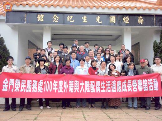 金門縣榮民服務處昨日辦理「外籍與大陸配偶生活適應成長營」,共計有六十餘位外籍與大陸配偶參加,上午安排三場法令、婚姻生活、居長照顧專題演講,下午則前往地區駐名產業及景點參觀。處長鄭有諒表示,期藉此讓大家更了解金門,更認知自我權益,融入在金門生活,建立圓滿幸福家庭。 金門縣榮民服務處於昨日上午九時起,假金門縣衛生行政大樓三樓辦理一場次「外籍與大陸配偶生活適應成長營」,吸引六十餘位榮民以及陸、外配參加,聽取專家解說自身相關的法令規章與權益和生活經驗分享。退輔會科長方矩、專員彭致和也抵金指導,與金門榮民服務處處長鄭有諒一起陪同陸外配聆聽演講。 鄭處長指出,政府自一九八七年開放民眾赴大陸探親,開啟交流大門。根據統計數據自一九九二年至二○一○年,在大陸完成結婚手續並經海基會辦理文書驗證之人數已達二十八萬人,其中榮民娶大陸配偶共兩萬零八十七人。 鄭處長也說明,面對新文化適應與社會支持不僅是陸外配一大挑戰,更是榮服處輔導的重要課題,為協助榮民之陸、外籍配偶能儘早適應金門生活、融入在地社會中,每年辦理是項活動,帶領榮民及其令一半一同學習成長。 「外籍與大陸配偶生活適應成長營」共安排三場次演講,分別由社會局社工師楊蕙禎,以「大陸及外籍配偶生活輔導措施及婚姻暴力防範說明」為題向與會人員分享,生活適應問題;移民署金門服務站主任謝友發也主講「生活輔導法令說明」;署立金門醫院護理師呂慧琳,則分享「老人日常生活照顧技巧」。 結束專題演講課程後,下午安排前往金門國家公園、金酒公司、聖祖貢糖食品公司、陳景蘭洋樓等參觀地區風景名勝及著名商家及產業。