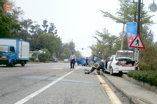 金寧地區伯玉路三段中山林前路段昨日下午發生一起車禍,一輛小客車疑因閃避對向左轉的車子而失速衝上左前方的花台及路樹後車子一百八十度迴轉卡住,車頭嚴重毀損,所幸王姓男駕駛人與乘客僅受輕傷由消防人員送醫,警方也針對車禍原因進行調查中。 據前往處理車禍的金城警分局警備隊車禍處理小組指出,這起車禍約發生於下午一時四十八分左左右,王姓男駕駛告訴警方,當時他開著車號0371-WV的自小客車,車上載著另一位劉姓男性友人,由伯玉路二段金城方向往伯玉路三段金湖方向行駛,於行經伯玉路三段中山林路口時,迎面一輛車子準備左轉進入中山林(金門國家公園管理處),王姓駕駛因為閃避不及車子衝上左前方的路邊花台車頭撞及花台及路樹後,車頭一百八十度轉向後卡在路旁花台後才停住。 車禍發生後,小自客車車頭嚴重毀損,前擋風玻璃破裂,驚魂未定的王姓駕駛與劉姓乘客由趕至救援的消防人員包紮後,送署立醫院就醫。警方據報趕往處理進行拍照測繪時也發現現場留有一條十餘公尺的輪胎痕,正進一步針對車禍發生的真正原因進行調查中。 金城分局指出,地區交通事故肇事地點以岔道最多,提醒駕駛行經路口時應減速慢行,並遵守路權規定,在行經無號誌路口時,支線道車應讓幹線道車先行,而未劃分幹、支線或同為幹線道或支線道者,轉彎車應暫停讓直行車先行;如同為直行車或轉彎車者,左方車應暫停讓右方車先行,以避免車禍發生,維護行車安全。
