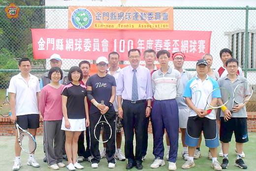 金門縣網球運動委員會舉辦之100年度春季盃網球賽日昨假國家公園網球場開打,經激烈角逐後各組成績也出爐,男子單打由陳肇德奪冠,男子乙組雙打冠軍:楊欽鎗、傅紫茵;男子甲組雙打冠軍:李根炎、黃國沛。其中從事網球運動20餘年的退休教師李根炎獲得個人首座冠軍獎盃受肯定,主任委員石兆瑉頒獎表揚各組績優,歡迎喜愛網球運動的朋友踴躍報名參加,共同推廣網球向下紮根工作,讓網球成為全民運動,為地區培訓更多優秀網球人才。 金門縣網球運動委員原訂於四月舉辦之100年度春季盃網球賽,因天候影響順延至日昨假金門國家公園管理處網球場開打,雖然當日天候不佳,但所屬會員30餘人仍冒著濃霧及細雨區分單打、甲組雙打及乙組雙打三個組別展開競技,眷屬更積極為選手加油,場面熱鬧非凡,金城鎮長石兆日主任委員在公務繁忙當中仍親臨比賽場地為選手加油外,前主任委員黃金郎及副總幹事楊粼粼並在球員休息區準備咖啡機,貼心的以熱咖啡及小點心慰勞全體球員之辛勞,鼓舞選手士氣。 比賽經激烈競爭角逐,各組脫穎而出得到成績如下:男子單打冠軍:陳肇德,亞軍:楊恭汪,季軍:蔡發家;男子乙組雙打冠軍:楊欽鎗、傅紫茵,亞軍:吳啟榮、李彥辛,季軍:楊粼粼、楊肅心;男子甲組雙打冠軍:李根炎、黃國沛,亞軍:李鳳瑞、王振科,季軍:劉希斌、徐平志。比賽中值得一提是金門高職退休教師李根炎歷經四輪挑戰,展現精湛的球技及超人的毅力,獲得個人從事網球運動20餘年來的首座冠軍獎盃,受到全體參賽選手之敬佩及肯定,主任委員石兆瑉表示,今年度暑假期間將辨理網球訓練營,以促進地區網球運動交流及發展,屆時歡迎喜愛網球運動的朋友踴躍報名參加,共同推廣網球向下紮根工作,讓網球成為全民運動,為地區培訓更多優秀網球人才。