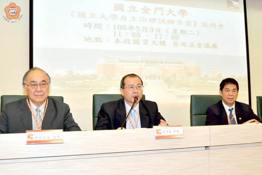教育部選定金門大學、成功大學兩校作為全國國立大學實施自主治理方案的試辦大學,預定明年起試辦,教育部高教司長何卓飛昨日率團來金向金大師生說明教育部推動「大學自主治理方案」目標與效益,他表示,教育部推動國立大學自主治理方案,目的是要讓大學有更大權限、更大的自主性,提升大學的競爭力。 這項「國立大學自主治理試辦方案」政策說明會昨日上午十一時起假金門大學圖資大樓黃進益會議廳舉辦,由金大校長李金振主持,何卓飛率高教司人員抵金向金大教職員工和學生代表說明試辦方案。 何卓飛說,教育部3月推出的「中華民國教育報告書」,針對未來黃金10年教育發展規劃,其中一項高等教育的改革政策就是推動大學自主治理,預定明年起試辦。 他也提到,過去推動國立大學自主過程中,一些大學老師憂心大學法人化後,制度性的大變革,教職員身分改變為非公職體系,影響退撫權益,很不支持,教育部體會到他們的心聲;因此,教育部採變革式的處理,並規劃由成功大學、金門大學試辦,做為全面推動大學自主的參考。 大學自主治理試辦政策的預期效益,包括提升學術競爭力、強化績效責任、促進專業管理、鼓勵外部資源及參與、解決爭議政策、轉型大學系統。何卓飛強調,就是要讓大學有更大的權限,有更大的鬆綁、更大的自主性、更大的競爭力。 何卓飛也說,選定金門大學為試辦學校,就是要讓金門大學走在其他大學前頭,教育報告書已經推出,推出之後,就要落實執行,是否成功需要全校師生有共識,要達成效益,仍須學校老師針對方案內涵作後續性的檢討。 說明會中,除了教育部做大學自主治理方案政策說明外,金門大學、成功大學也提報自主治理籌辦過程,並且邀請清華大學、陽明大學、交通大學等校多名副校長來金分享經驗。 教育部自主治理試辦方案政策,試辦期為四年,是在不修法、現有行政人員權益不變前提下,以行政命令核定實施,由教育部會協調各部會針對授權之範圍達成共識。讓成功大學與金門大學進行大學自主試辦方案,成立類似私校董事會的「大學自主治理委員會」,可決策校長的產生、學雜費調整、招生名額、學院系所的增設、預算的議決等重大事項,落實大學自主。
