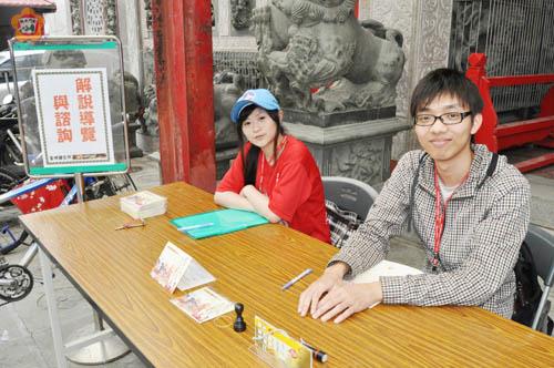 為迎接浯島迎城隍盛大廟會,金城鎮公所特別請國立金門大學觀光管理學系自昨(一)日起至五月三十一日止,每天下午分成兩個時段,於浯島城隍廟、陳氏宗祠擔任駐點解說導覽服務工作及駐點解說諮詢服務(見圖,楊水詠攝),協助前往參觀的民眾深入了解金門迎城隍之事典與緣由,以及地方特色與文化。 金城鎮公所表示,農曆四月十二日浯島迎城隍,回溯清康熙十九年(西元1680年),金門鎮總兵從金門城移駐後浦,城隍也跟著遷治,鄉親於每年農曆四月十二日舉行城隍巡安遊行慶典,自清朝廟會沿襲至今已有三百多年的歷史,迎城隍為金門地區最大、最熱鬧的廟會慶典活動,也是保留前清古制的盛大廟會。 金城鎮公所表示,於今年迎城隍慶典活動期間(五月一日至三十一日),每日下午一時至下午四時與晚上七時至晚上十時的兩個時段,解說志工分別於城隍廟、陳氏宗祠,提供駐點解說導覽服務。金城鎮長石兆瑉表示,對金門人來說,每年農曆四月十二日是個最重要的日子,許多在外的遊子會紛紛返鄉,金門島內的鄉親也趕往參與慶典。 另外,這次也提供駐點解說的陳氏宗祠「後浦十六藝文特區」,為保留閩南傳統建築群店屋,已透過公開招標進行招租,經營項目將包含軍事特色藝文飲品、軍事藝品、下午茶及點心、格子舖、體驗工坊、琉璃、愛爾蘭咖啡、冠軍馬鈴薯泥等,預計於五月十四日(農曆四月十二)開幕。