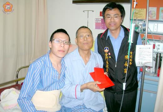 金門籍的大學生王志沛捐肝救父,孝行感動人。台北市善心人士王先生捐款二萬元雪中送炭,金門的李小姐也捐了一千元,鼓勵王灶福、王志沛父子加油,早日回復健康。金門縣政府台北服務處主任陳永富也幫兩父子申請財團法人昇恒昌基金會急難救助金二萬元,前天(二十八日)下午一併轉交給在台北榮總病房療養的王灶福父子。 王灶福、王志沛父子沒料到縣府台北服務處主任陳永富主動替他們申請救助金,以及善心的王先生、李小姐捐款幫助他們,頻頻道謝;王灶福的妻子許能美還特別打電話,向王先生、李小姐及昇恒昌基金會表達誠摯謝意。 陳永富表示,前天轉送的四萬一千元捐助款,盼能暫解王家困境。另有一位經商有成的金門鄉親,主動聯繫陳永富,表明在王灶福父子出院結算醫療費時,將盡力幫忙,減輕他們的負擔。陳永富向王家父子轉達此消息,請他們暫時不要煩惱醫療費用問題,安心療養。 昨天(二十九日)續有台北市黃小姐,表示也將捐款幫助王家。 五十七歲的金城鎮民王灶福罹患肝硬化、肝癌,經台北榮總外科部肝臟移植小組主治醫師龍藉泉等會診,必須移植肝臟才能活命。就讀南亞技術學院一年級的王志沛(二十一歲),於四月六日進手術室,割了三分之二肝臟,移植給父親救命。 榮總外科部肝臟移植小組的手術相當成功,兩父子在動手術後兩周,即轉至普通病房,並能下床走動。王灶福沒有明顯的肝臟排斥反應;王志沛再過幾天,即可出院回家療養,預期約六個月,所切除的肝臟即可回復原樣大小。 不過,由於王家近貧,在國小當保全員的王灶福與任職金門縣政府林務所契約工的王妻薪資微薄,兩夫妻為了可能需數十萬元的捐肝手術等醫療費用,憂心不已。 金門縣長李沃士日前特別撥空到榮總病房探視王灶福父子,他讚揚王志沛捐肝救父的孝行,贈送慰問金,也表明縣府將盡力協助。 陳永富前天再次轉達李縣長的關心祝福。他並以兩父子以後將「同肝共苦」,父子關係將更緊密結合,同享彩色人生,為他們加油打氣。