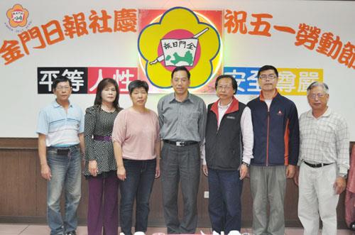 金門日報社昨天慶祝五一勞動節,社長陳大鵬頒獎表揚九位模範勞工,他肯定員工的工作表現,並願意協助讓大家工作愉快,圓滿完成任務。 本報慶祝五一勞動節活動昨天晚間六時舉辦,由社長陳大鵬主持,日夜班員工出席與會,共同慶祝屬於勞工的佳節。 在慶祝活動中,陳社長頒獎表揚九位模範勞工,每人頒發獎狀一幀及獎金一千元,並向他們道賀;得獎人名單有:李增汪、蕭志清、陳能英、吳火來、黃金、許瑞芬、翁春松、陳振盛、蔡天禮等人。 陳社長致詞時,肯定九位模範勞工工作上的表現,強調得獎是一種榮譽、也是一種責任;同時,陳社長對於報社員工在工作上的認真與辛勞,均給予肯定。 接任社長昨天滿一個月,陳社長說,他也是勞工出身,所以對於員工工作職責和任務都了解;雖然工作性質不同,他願意來協助員工,讓大家在工作崗位上工作愉快、圓滿的完成任務。 陳社長說,「平等、人性、安全、尊嚴」是報社慶祝勞動節的主題,他很感動,希望員工朝此目標努力,並以安全為重,若沒有安全再怎麼尊嚴都沒有用;所以,希望員工在各自的工作崗位和職責,能本著報社的精神,追求更上一層樓的表現和成果。 陳社長也希望藉由慶祝勞動節表揚聯誼餐會,員工能在工作上互相切磋;他也表示,同仁在工作上有任何問題,可以與他溝通,共同尋求解決問題。