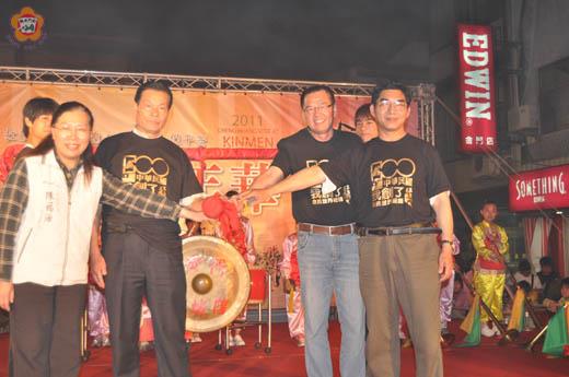 2011年金門迎城隍踩街化妝嘉年華活動,昨日晚間在金城鎮長石兆瑉、鎮代會主席陳天成等人敲響大鑼後,在三級古蹟總兵署前熱鬧登場,吸引上千名鄉親到場參加,共同感受迎城隍的熱鬧氣氛,也為今年迎城隍系列活動正式掀開序幕。 這項「踩街化妝嘉年華活動」,昨日晚間七時三十分進行開瑄國小二十四節令鼓表演;隨後由金城鎮長石兆瑉、浯島城隍廟主委周浯斌及鎮代會主席陳天成、立委陳福海辦公室主任黃秀珍等人共同主持擊鼓儀式,為迎城隍活動揭開序幕。 鎮長石兆瑉表示,每年農曆四月十二日迎城隍為金門島上最大的民俗慶典,這項活動迄今已有三百三十一年的歷史,為了讓迎城隍民俗慶典更有看頭,促進金門觀光,今年迎城隍的百節蜈蚣座陣頭,規劃長度為168公尺,已向金氏世界紀錄委員會申請為純人力最長蜈蚣座陣頭,將接受認證,為建國100年的金門廟會寫紀錄,歡迎鄉親踴躍報名參與。 石兆瑉希望透過結合傳統與創新的化妝表演,以及具有金門在地特色的民俗藝陣,打造新亮點,吸引更多遊客及民眾參與,也為金門迎城隍活動暖場,營造濃厚的慶典氣氛。 陳天成感謝參與活動的鄉親,讓城隍活動更加有意義、更加蓬勃熱鬧,透過大家的參與推動讓城隍活動更加發揚光大與傳承,成為金門地區一項宗教慶典活動,也讓觀光客認識金門的廟會文化。 踩街隊伍昨晚從總兵署出發,參與踩街的隊伍包括:人力蜈蚣座、中正國小舞獅表演及鼓吹隊、金門縣天后宮蓮花鑼鼓陣與十二婆姐、古城國小千尺浪以及金門大學企管系、運管系的化妝主題。踩街路線以總兵署廣場為起點出發,經莒光路│中興路南段│城隍廟│光前路│外武廟│民權路│六桂堂│內武廟│中興路│北鎮廟│金城車站│商會│模範街│貞節牌坊│再回到總兵署廣場(終點)。 當踩街出發的同時,在總兵署前廣場一樣有精彩的表演,由金西堡傀儡戲團帶來的傀儡戲表演,透過表演師傅靈活的手底功夫,靈活操作絲線,讓懸絲傀儡展現誇張的動作,此外也邀請台灣廖武雄布袋戲劇團進行金門有史以來首次的戶外大型布袋戲公演,將電視上的大型木偶直接搬出戶外演出,讓觀眾體驗難忘的視覺饗宴。 踩街遊行隊伍除了繞行市區,並於總兵署廣場前進行節目演出,有中正國小舞獅表演、金門縣天后宮蓮花鑼鼓陣與十二婆姐、古城國小千尺浪、以及金門大學企管系、運管系的化妝主題表演,吸引上千名鄉親到場參加,共同感受迎城隍的熱鬧氣氛。 石兆瑉表示,這項踩街化妝嘉年華,將於五月七日晚上六時三十分在清代「金門鎮總兵署」廣場繼續舉辦第二場次,期望藉由迎城隍系列的民俗表演活動,提供夜遊城區的觀光旅客一個觀看表演的去處,體驗地區的各種不同習俗和傳統文化。