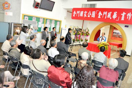 金門國家公園慶祝建國百年系列活動之一的「金門風華」畫作專題展覽,目前刻正在文化局第一、第二展場展出,並於昨天舉辦開幕茶會,縣長李沃士和參展畫家、藝文界人士出席盛會;李沃士希望畫家們把金門最美的景物,透過彩筆和作品,行銷金門,也讓全世界更認識金門,並祝「金門風華」展展出圓滿成功! 「金門風華」畫作專題展覽自十三日起在文化局展覽,展期至五月四日止,總共展出生態與藝術做結合的一百二十四幅畫作,透過畫家對美的敏銳觀察力,以及水墨畫行銷國家公園之美,弘揚固有傳統繪畫藝術,並促進觀光繁榮地方,提升國家形象與國際地位。 開幕茶會於昨天上午十一時,假文化局一樓大廳舉辦,縣長李沃士、金管處處長曾偉宏、縣府文化局長李錫隆、金中校長蔡錦杉、金門農工校長陳水芳、金城國中校長楊瑞松、金門榮民服務處處長鄭有諒,以及中華現代國畫研究學會理事長陳銘顯和參展畫家,約上百人出席參與盛會。 金管處處長曾偉宏致詞表示,此次「金門風華」展覽對於金門文創產業有很大的幫助,並與金門縣長李沃士推動觀光發展是相輔相成的;同時,他也感謝來自全台各地的畫友畫家透過彩筆揮灑創作,共同為金門注入新的生命力、且美不勝收。 縣長李沃士表示,對於愛金門和關心金門的畫家們,表示感謝;同時也感受到很多的金門好朋友,願意來幫助金門及行銷金門。他說,對於繪畫是門外漢,但看到美的東西,讓人賞心悅目,且非常的高興;並也請畫家常來金門走一走,把金門最美的景物,透過彩筆和作品,讓全世界均能更認識金門,並祝金門風華展展出圓滿成功。 中華現代國畫研究學會理事長陳銘顯表示,金門以往是戰地,有著許多可歌可泣的故事及地方;也由於金門人多方面的奉獻、犧牲及努力,讓台灣本島人民可以安居樂業,是十分令人敬佩的地方。而且,金門也有豐富的人文資源及戰役史蹟……,中華現代國畫研究學會在金管處的協助之下,讓優秀畫家作品得以在金門展出。 他說,中華現代國畫研究學會先後於2007年首次與雪霸國家公園管理處聯合主辦:「彩墨雪霸」專題展覽,2008年與太魯閣國家公園管理處聯合主辦:「縱橫太魯閣」專題展覽,2009年與墾丁國家公園管理處聯合主辦:「印象墾丁」專題展覽,旨在推廣民眾保育、復育及生態維護觀念。 今年、也是建國百年,陳銘顯說,畫會與金門國家公園管理處聯合主辦:「金門風華」專題展覽,此也是國畫水墨界與國家公園首次共同主辦大規模專題巡迴展覽,將生態與藝術做結合,透過畫家對美的敏銳觀察力,藉國畫水墨作品行銷國家公園之美,弘揚我國固有傳統繪畫藝術,並促進觀光繁榮地方,提昇國家形象與國際地位。另,此次巡迴展經費由財團法人福臨文化藝術基金會贊助,亦為產官學合作、實踐文化創意產業之優良典範。 陳銘顯說,國畫是我國傳統繪畫藝術文化,且有悠久的歷史;國畫與西洋畫最大不同之處,它在於筆墨和意境,畫家保有優點,且與現代藝術相結合,而金門風華展代表著固有筆墨繪畫藝術意境及旨趣。 縣長李沃士和金管處處長曾偉宏致贈「金門風華」畫作專題展覽畫冊給陳銘顯,並在他及畫家引導下,進入第一展場觀賞一幅幅以金門國家公園為繪畫創作題材的作品;此次畫作由藝術家以筆法、墨氣酣暢淋漓之氣韻,呈現出水墨、彩墨、墨彩、重彩等不同表現形式,揮灑出屬於金門之風華。 此次畫展中,陳銘顯的作品當中常將透視、比例、明暗、色彩等西洋繪畫技巧,融入傳統國畫意境裡,卻能兩者兼容並蓄,營造現代國畫特色,獨具風格。而,來自俄羅斯的台灣女婿楊安東書畫家,畫風偏向人物寫實派,愛畫人像,畫作中西合璧。 另外,台東大學教授林永發以一幅「高粱初熟鳥先知」為金門的自然作了最好的見證。另外,洪昌穀對水墨繪畫的創作有獨到的看法:「藝術創作是作者哲思的反映,惟有出於真誠,匠心獨運,方能引發共鳴,令人玩味。」黃埔軍校19期的倪汝霖曾率兵戍守金門,如今以八十七歲的手握著畫筆,筆下眼裡是多麼的激動。歡迎喜歡與關心繪畫的鄉親與好朋友結伴前往觀賞,分享一場美的視覺饗宴。