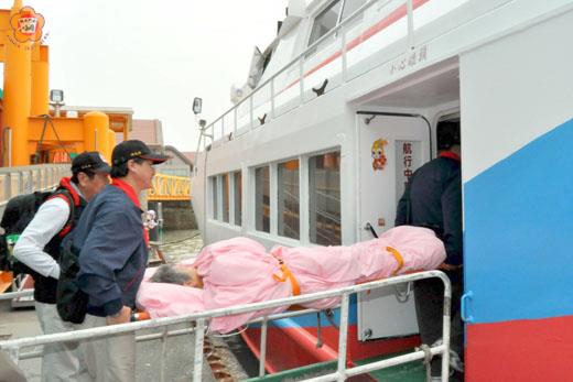 高齡72歲大陸河南省李妞果老太太與老伴隨團小三通經由金門搭機赴台旅遊,不料於飛機起飛不久後突發腦溢血,飛機返降金門機場後送即往署立金門醫院救治,金門紅十字會昨日下午應病患家屬請求,派員護送她回大陸廈門市第一醫院進一步治療。 李妞果老婦人與丈夫參加河南省旅行團赴台灣旅遊,前天(十日)自廈門搭船到金門中轉,當日下午一時轉搭乘復興航空班機到台北時,在飛機起飛五分鐘左右,李老太太突然身體不適。 復興航空班機緊急返降金門尚義機場,並聯絡救護車將李老太太送往署立金門醫院救治,院方診斷為腦溢血,經住院治療,病情稍穩定後,家屬要求能返回大陸治療。 金門縣紅十字會接獲旅行社求助申請後,隨即啟動救援機制,昨日下午並由總幹事陳忠飛率同救護小組成員陳森照、林再求、何慶輝等人前抵水頭小三通碼頭待命,在隨行家屬(李妞果的先生)陪同下,護送無法行動的李姓老婦搭乘下午四時開航的金廈航線金星輪到廈門五通碼頭,並由廈門市紅十字會人員協助及李老太太兒子陪同下,轉送廈門市第一醫院治療。 昨日李老太太的另一半陰老先生在陪同老伴離開金門前,也對於金門縣紅十字會及相關單位伸出援手給予協助,一再揮手致意,一句句「謝謝同胞!謝謝!」,表達他們內心的感激之情。
