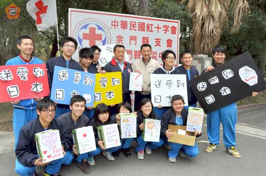 日本發生地震、海嘯及福島核電廠輻射外洩造成災情,金門高中扶少團、童軍團、管樂團、弦樂團等各社團發起「送愛到日本」募款活動,募得五萬多元善款,昨日交由金門縣紅十字會用於賑災,傳送金門高中學生的愛心到日本。 日本地區於3月11日發生芮氏規模9.0強震,並引發高逾10公尺的大海嘯,造成民宅建築坍塌、被海嘯沖毀,加上地震所造成福島核電廠輻射外洩造成嚴重災情,急需其他友邦國家與善心團體援助。 金門高中扶少團團長黃彥瑋率同童軍團長張展華、管樂團長吳偉豪、弦樂團長陳高、熱舞社長陳庭宇、魔術社長陳紹軒及志工夥伴八十餘人,在第一次段考(清明節)後召開募款籌備會議,4月9日早上9時從金城車站出發,分成小組前往車站、便利商店、大賣場、加油站及各村里社區聚落募款,一整天下來獲得許多學生及民眾熱烈迴響,共募款53,030元響應日本震災行動。 社團代表昨日在扶少團指導老師張序伯帶領下,將愛心款送到金門縣紅十字會,由總幹事陳忠飛代表接受,將透過中華民國紅十字總會,把愛心送到日本災區,協助重建家園。 陳忠飛指出,中華民國紅十字會發起的這項「日本賑災」捐款活動,將持續至本月三十日止,他呼籲地區民眾以實際的行動響應紅十字會所發起的善款濟助日本災區重建的愛心行動。金門紅十字會的劃撥款帳號為:「1949-5302」,戶名為:「中華民國紅十字總會金門縣支會」。並請註明「日本賑災」。