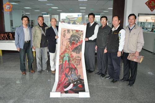 三月瘋媽祖,四月迎城隍!配合金城鎮公所建國百年迎城隍主題活動,金門縣美術學會和金門縣書法協會聯袂將於熱鬧、喜氣,又溫馨的五月份在鎮公所舉辦迎城隍書畫展覽,並以城隍為展覽主題,共襄盛舉,炒熱四月十二日迎城隍的熱鬧氣氛。 金門美術學會理事長楊誠國、金門縣書法協會理事長洪明燦兩人昨天偕同書畫界人士徐心富、吳宗陵及美術學會總幹事盛崧俊等人,在昨天上午十一時左右,他們前往金城鎮公所拜會鎮長石兆瑉,並就配合迎城隍主題舉辦書畫展宜研討,石兆瑉表示,目前鎮公所規畫有一處小藝廊,歡迎書法及美術兩會配合迎城隍主題舉辦書畫展覽,共成就一樁藝文和宗教文化的美事。 在拜會中,楊誠國致贈以一幅「七爺八爺」為創作主要題材的「迎城隍」畫作,而水墨大師徐心富也贈送一幅以迎城隍為體材的「城隍聖蹟」畫作,鎮長石兆瑉接受致贈,並推崇楊誠國和徐心富在金門書壇的成就。另外,金門縣書法協會理事長洪明燦也將致送書有「城隍庇佑,浯島平安」的書法作品,於迎城隍書畫展時展出。 楊誠國表示,「迎城隍」作品色彩用紅色代表喜慶,而七爺八爺也是迎城隍的主角之一;同時,「迎城隍」也是祈求平安和保佑、庇佑,縣運昌隆,居民安居樂業及生活幸福。而,徐心富表示,每年迎城隍都很隆重和盛大,心想藝術界若能盡點心力,共襄盛舉,也是義不容。他說,「城隍聖蹟」畫作是來自小時候迎城隍的印象,以盛重的心情,花了五、六天、每天畫好幾小時始完成、有著祝福。 石兆瑉表示,今年迎城隍活動有兩個重要的元素,一是蜈蚣座、一是扛輦,最大的特色是用人力去抬;而且,今年迎城隍值逢建國百年,金城鎮公所主導舉辦的是「百節蜈蚣座」、「百輦」兩個申請世界紀錄的創新活動;雖然目前不敢打包票舉辦得成,但一直跟英國方面溝通申請世界紀錄事宜。 石兆瑉指出,二個月前台南才申請二百零八公尺的蜈蚣座申請世界紀錄,但他們的蜈蚣座是有輪子的,與鎮公所申請以人力抬的是不同的;但英國方面弄不清楚兩者有可差異?他說,以人力抬輦是創新元素、最原始的,並全力溝通有輪子的輦和用人力抬輦的不同之處,以及希望採取不同組別,若英國方面聽得,金城鎮就是「百輦」的開山始祖。 至於配合金城鎮公所迎城隍主題活動舉辦的書畫展覽,美術和書法兩會研商的結果,展期將於五月上旬展開,展出書畫作品一部份以城隍為題;而且,也計畫一項共同創作城隍作品,期讓整個展覽及迎城隍活動更形增色和光彩。 另外,目前金城鎮公所小藝廊規畫一個月為一個展覽檔期,一年有十二個檔期,也得到書法和美術兩會的支持,將安排書畫作品展出,石兆瑉表示樂觀蜞其成,也感謝兩會對於藝文活動的支持,希望透過小藝廊各檔期的展覽,帶動地方的藝文氣息及內涵,增加文化生活的氣質。