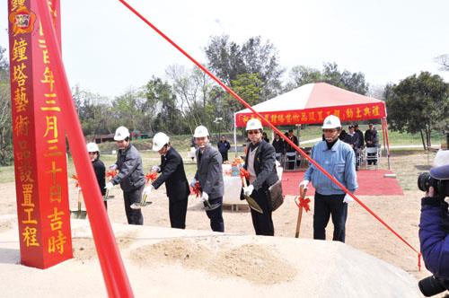 慶祝建國一百年和平鐘及鐘塔藝術品設置工程動土典禮,昨天在金門和平紀念園區舉行,預定在「八二三砲戰紀念日」敲響和平鐘,象徵國人對和平的愛好與渴望,期盼和平的鐘聲撫平戰爭傷痕,讓全世界聽到中華民國追求和平的聲音。 文建會和建國一百年基金會共同主辦的和平祈福日活動,預定八月二十三日「八二三砲戰」紀念日在金門舉行,將把昔日殺人的砲彈轉化成和平鐘,並且舉行敲鐘典禮,也歡迎各宗教團體一起來共襄盛舉發出聲音,讓全世界都聽得到,傳遞我們也是愛好和平的民族。 文建會這項和平鐘及鐘塔藝術品設置工程動土典禮於昨日上午十時舉行,由行政院文化建設委員會主任秘書蔡湘主持祭典、陪祭者包括金門國家公園管理處處長曾偉宏、金門縣政府主任秘書盧志輝、縣府文化局長李錫隆等。祭典由蔡湘遵循傳統禮俗行三獻禮,並與陪祭者一起將八二三砲戰時代遺留下來的砲彈殼,埋藏在和平鐘基地底下,象徵讓和平的種子在土地生根發芽。 蔡湘指出,金門歷經古寧頭戰役、八二三砲戰等洗禮,屏障台灣的安全,金門最有資格作為建國一百年的和平鐘設置地點,當地軍民都能堅忍為保衛國家屏障來犧牲奉獻,這精神深植民心令人感佩。他說,世界上有許多和平鐘的地標,國內也應該有一座和平鐘地標來象徵民眾對和平的愛好。值此建國一百年慶祝特選在金門作為和平鐘地點,象徵國人對和平的愛好與渴望。期盼和平的鐘聲,撫平戰爭傷痕,讓全世界聽到台灣人民追求和平的聲音。 盧志輝也表示,金門建縣於民國四年,不敢稱與國同壽,但九十六年的歷史中沒有一天背棄國家,因此在建國百年慶祝活動,李縣長表示金門一定不能缺席,也感謝文建會與基金會協助安排讓和平鐘活動在金門舉辦,金管處也全力協助,總算在今天舉行動土儀式,並希望能於八月廿三日如期舉辦這項和平祈福日活動。