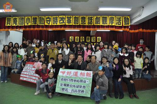 為宣導養成守時習慣,金城鎮賢庵國小昨日舉辦「守時改革」創意話劇觀摩比賽,由中、高年級學生組隊參加演出,金城鎮長石兆瑉受邀擔任評審,對學校以「時間」為題材編劇,並以生動逗趣的表演方式,宣導改良地方「宴會不守時」之陋習,認為舉辦這項活動意義非凡,同時邀請優勝隊伍參加鎮公所協辦的「浴佛孝親報恩祈福園遊勝會」活動節目表演,配合響應「全民守時運動-獎勵民眾宴客準時開席活動」,將守時觀念之重要性深植於民心。 賢庵國小以學校生活教育改進事項暨社會風氣輿情反映與民俗願景為依據,特舉辦這項「守時改革」創意話劇觀摩比賽,參加對象以該校四、五、六年級學生(校本部每班一隊、分校一隊)參賽。校長董國正期盼以推廣生活教育,改善社會風氣,增進學生「時間管理」素養,透過學生以「時間」為題本,發揮創意編劇,並以生動逗趣的表演方式,宣導改良地方「宴會不守時」之陋習,使參賽者及觀看學生在潛移默化之中,提升「守時」的觀念及常識,以達寓教於樂的效果。 這項守時改革創意話劇觀摩比賽於昨日上午假校本部地下室禮堂舉行,計有四隊報名角逐,評分標準以(一) 主題內容(30%):有無彰顯『宴會守時』宣導主題。(二) 表演方式(25%):含肢體、聲音、表情、動作流暢並與主題呼應。(三) 整體表現(25%):道具製作、音效及演員之間默契…等。(四) 創意得分(10%):編劇是否含有屬於自己的獨特與創意性。(五) 造型得分(10%):服裝是否足以讓評審留下深刻印象…等。各隊維妙維肖生動逗趣的演出,獲得全校熱烈掌聲,尤其製作「喜宴準時開席可獲得鎮公所高粱酒一打相贈」的海報,更是引起同學熱烈的掌聲。比賽成績也當場揭曉,由垵湖分校奪得優勝成績,將於擇日利用朝會時間頒獎表揚。 鎮長石兆瑉呼籲縣民一同響應「全民守時運動-獎勵縣民宴客準時開席活動」,希望藉由該活動的推行,改善民眾喜慶宴會未能準時開席之普遍陋習,降低縣民因喜慶宴會延遲開席所付出之社會、交通及經濟等成本效益,藉由準時出席喜慶宴會養成守時習慣,進而移風易俗,將守時觀念之重要性深植於民心,建立現代優質國民之價值觀。