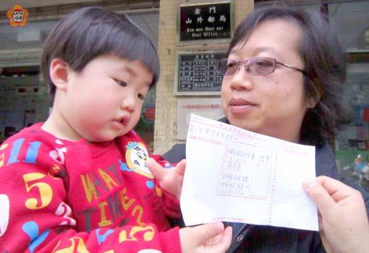 張建騰/圖文 愛的教育! 年僅兩歲的楊宸安在父親楊文斌抱著,到山外郵局匯款給中華民國紅十字會總會,目的是要幫助在日本地震、海嘯、核輻射中受難的人。 楊文斌表示,楊宸安捐款的錢,主要是他自己的壓歲錢。楊文斌希望孩子從小就學會大愛。