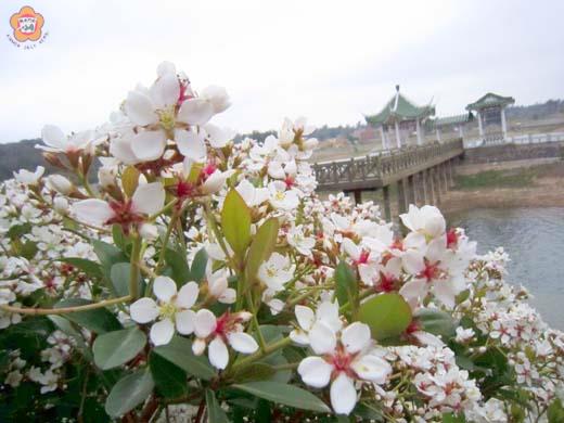 張建騰/圖文 「小徑」村「蘭湖」畔的石斑木已經進入花季-由「蘭亭」的九曲橋回望,可以看到一片白花花,白皎皎! 春風回飆入小徑,春水回波在蘭湖;蘭亭回看石斑木,白花回春蔚春圖。石斑木是薔薇科石斑屬的植物,花朵很美麗。蘭湖畔植有一排田斑木,有的樹冠已經綴滿花朵,白淨淨,白皓皓。 由蘭湖畔近看,一樹的白花,白得很美麗,構成了白的美;由蘭亭橋遠眺,一岸的白花,美得很白皙,構成了美的白! 石斑木的每朵花都有五片花瓣;每片花瓣約比成人的小指指甲略小。春風拂過,白花如玉屑灑落在地,美不勝收。
